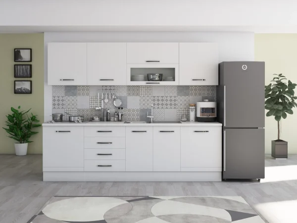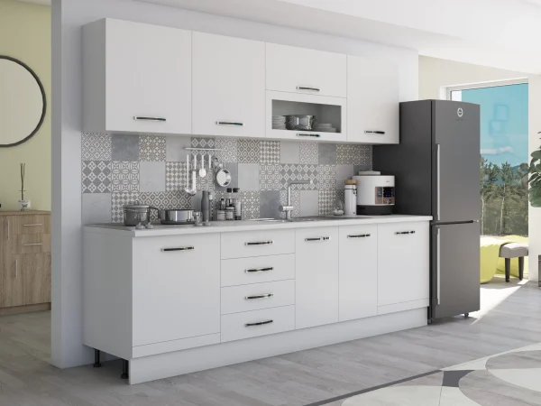 Bucatarie Alfabet cu corp vitrina, 260 cm, Alb