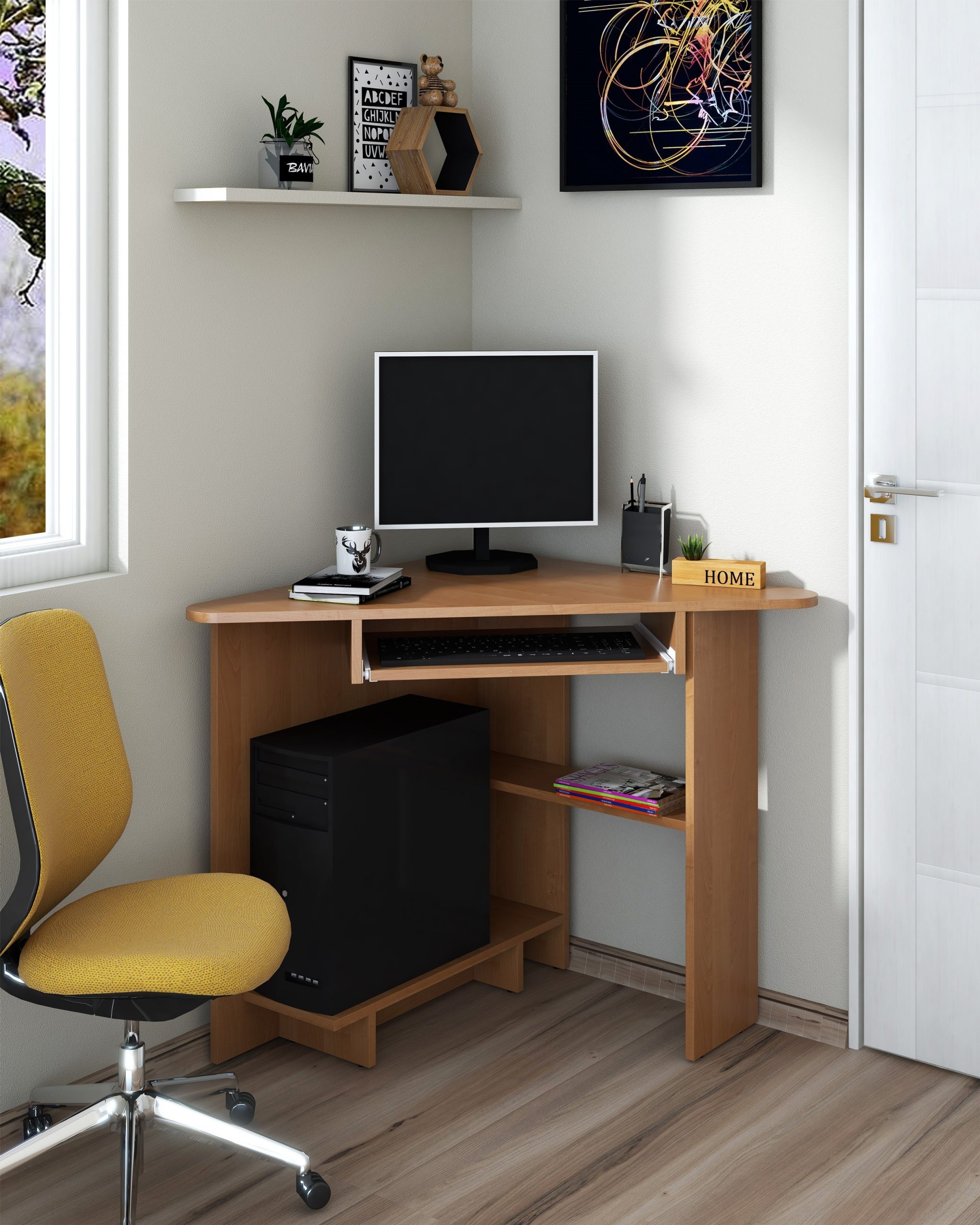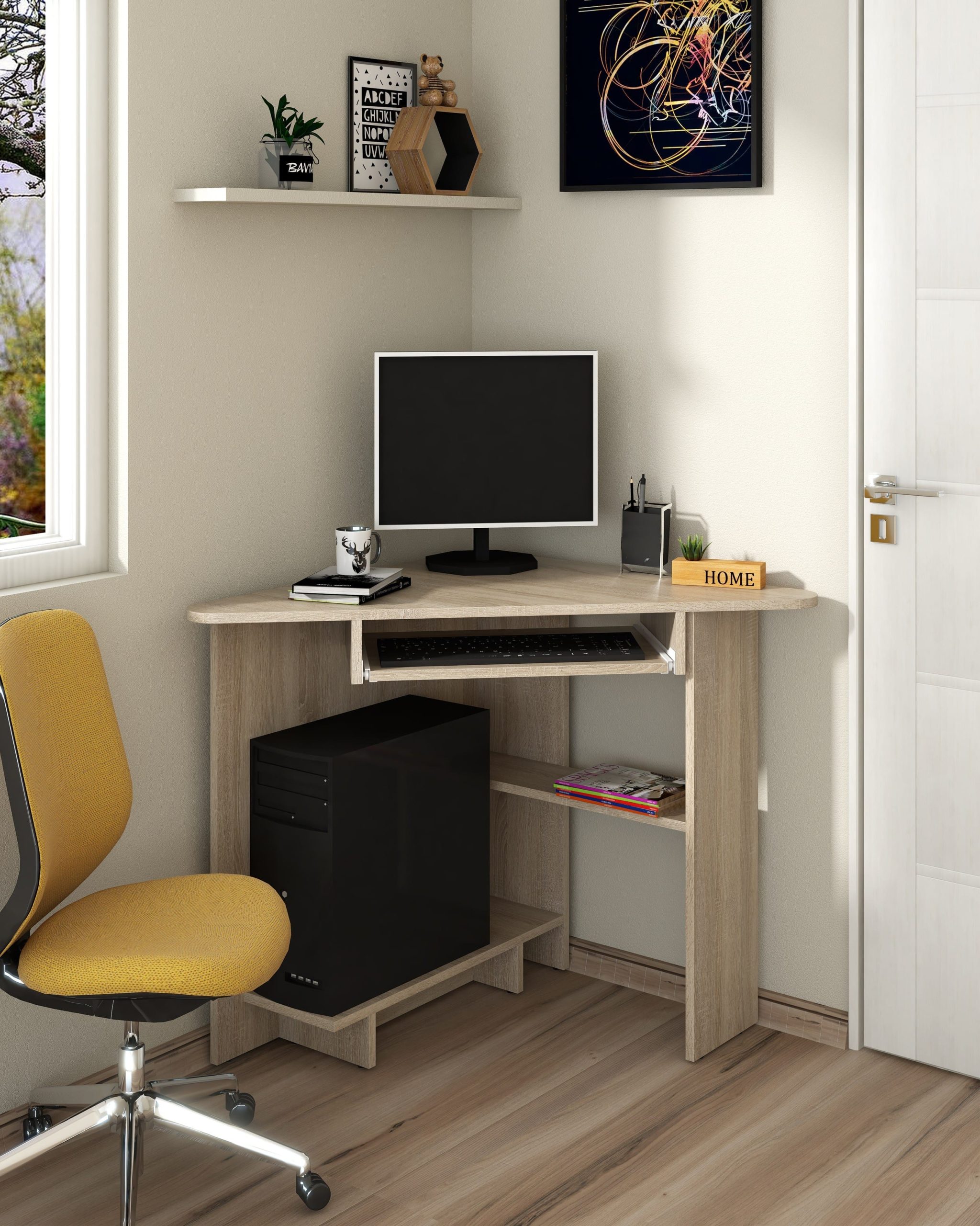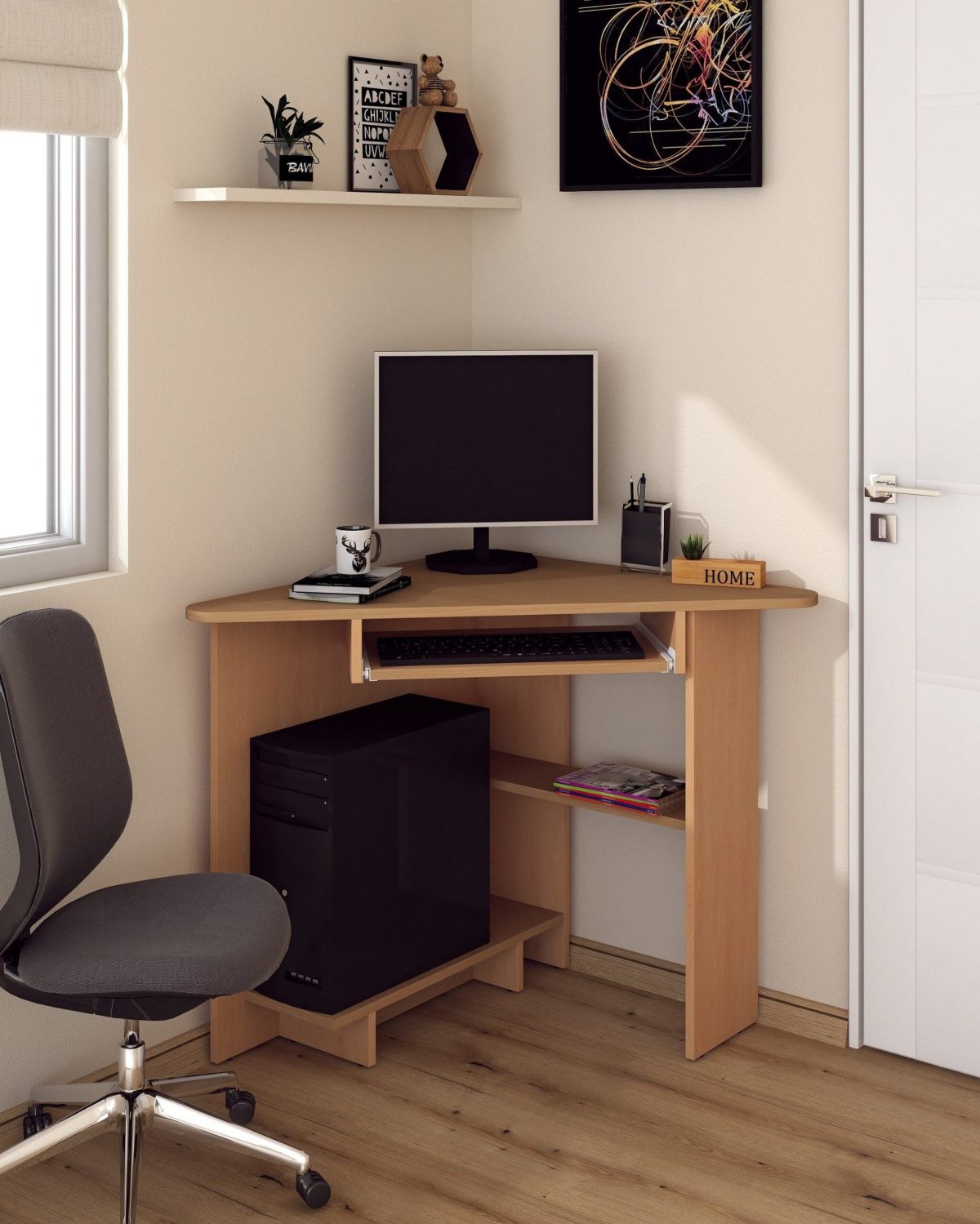 Biroul SU-15 este un birou pe colt, prevazut cu suport glisant pentru tastatura, suport pentru unitate si un raft depozitare in partea inferioara.