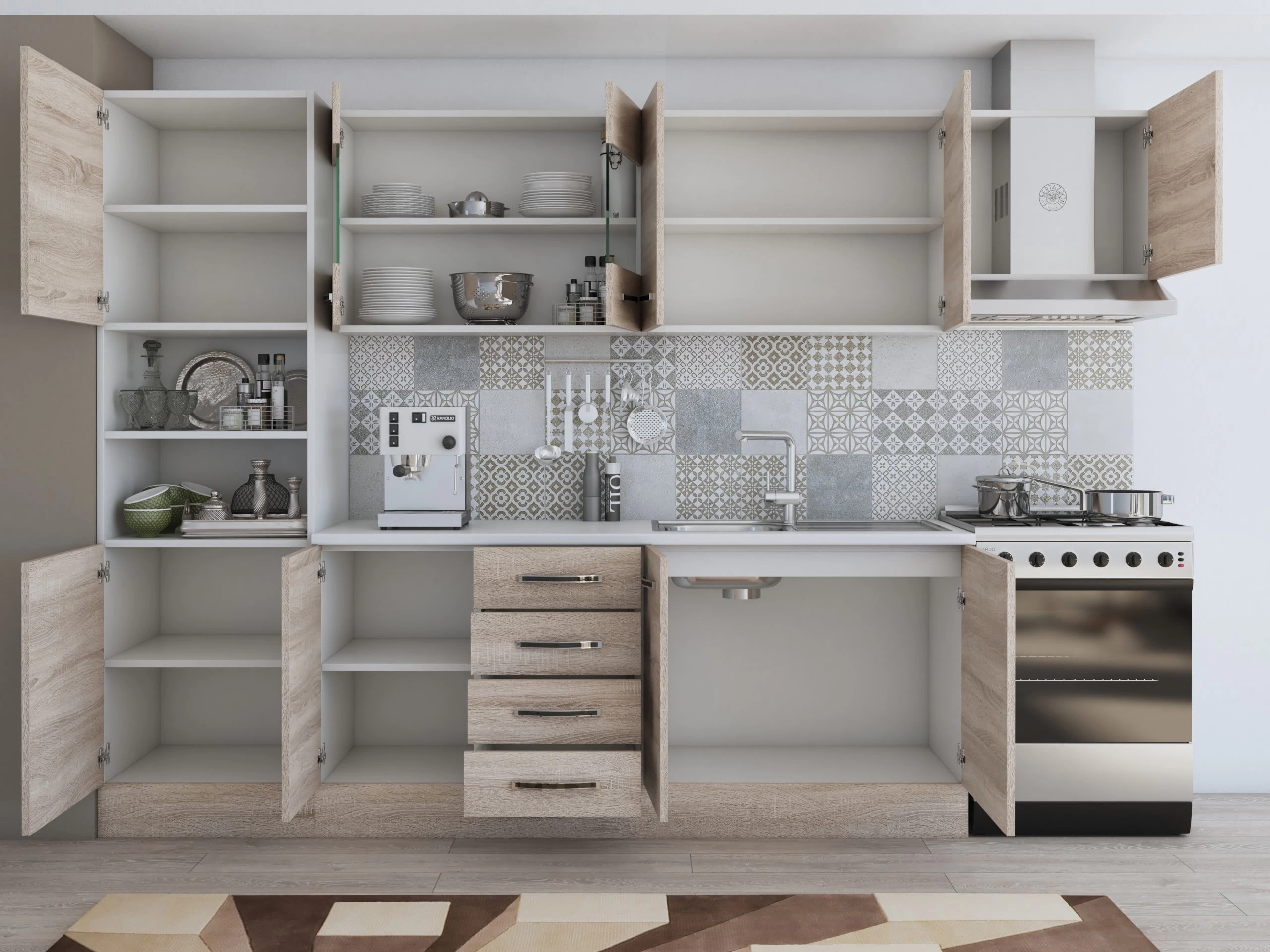 Bucatarie Alfabet cu corp soldat si vitrina, 300 cm, Sonoma