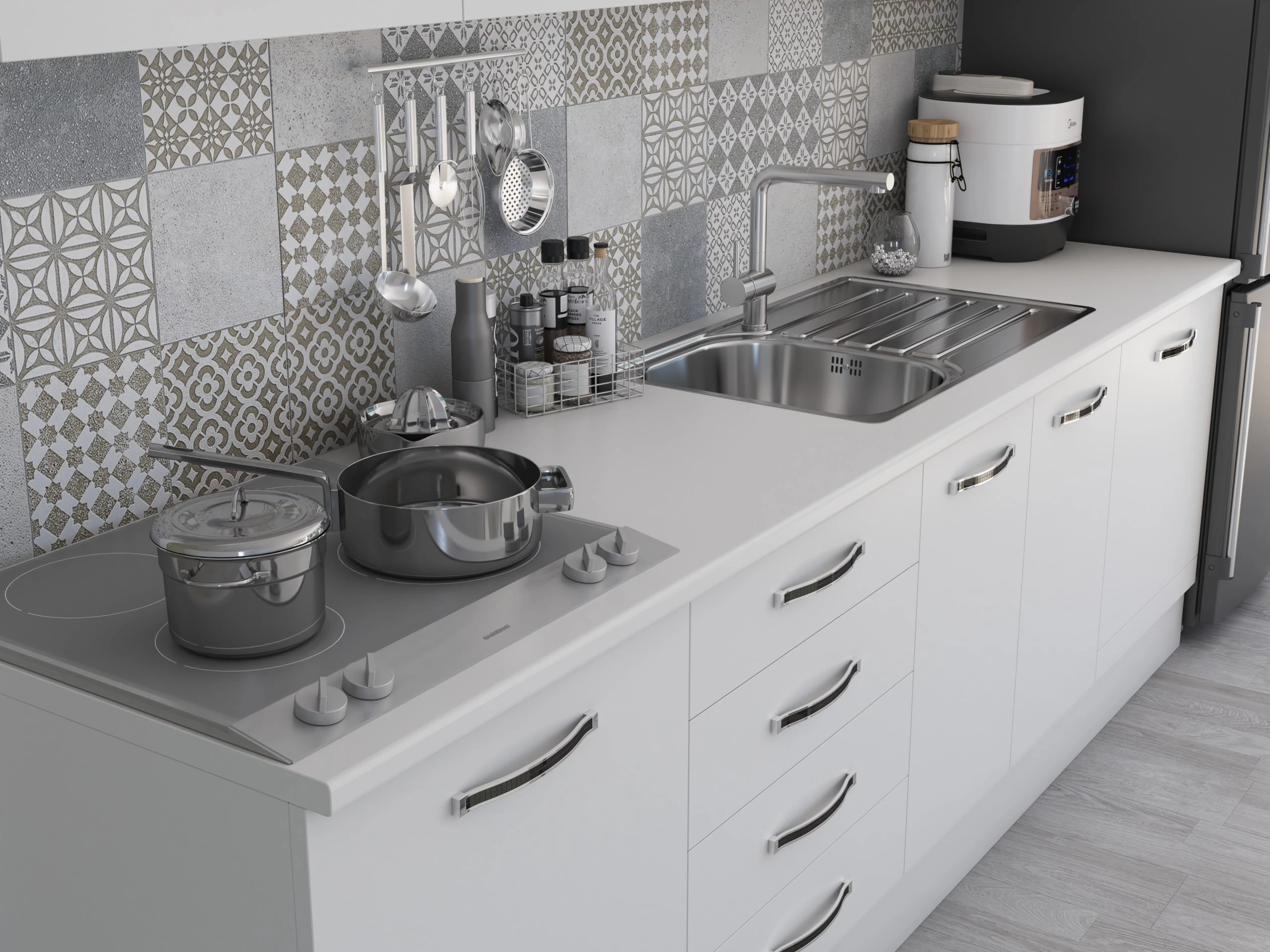 Bucatarie Alfabet cu corp vitrina, 260 cm, Alb
