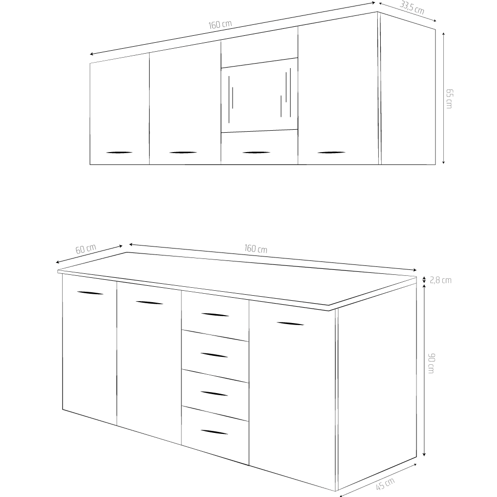 Corpurile superioare (2) au inaltimea de 65 cm, adancimea de 33,5 cm, lungimea de 80 cm si 4 usi, fiind potrivite pentru depozitarea veselei si condimentelor.