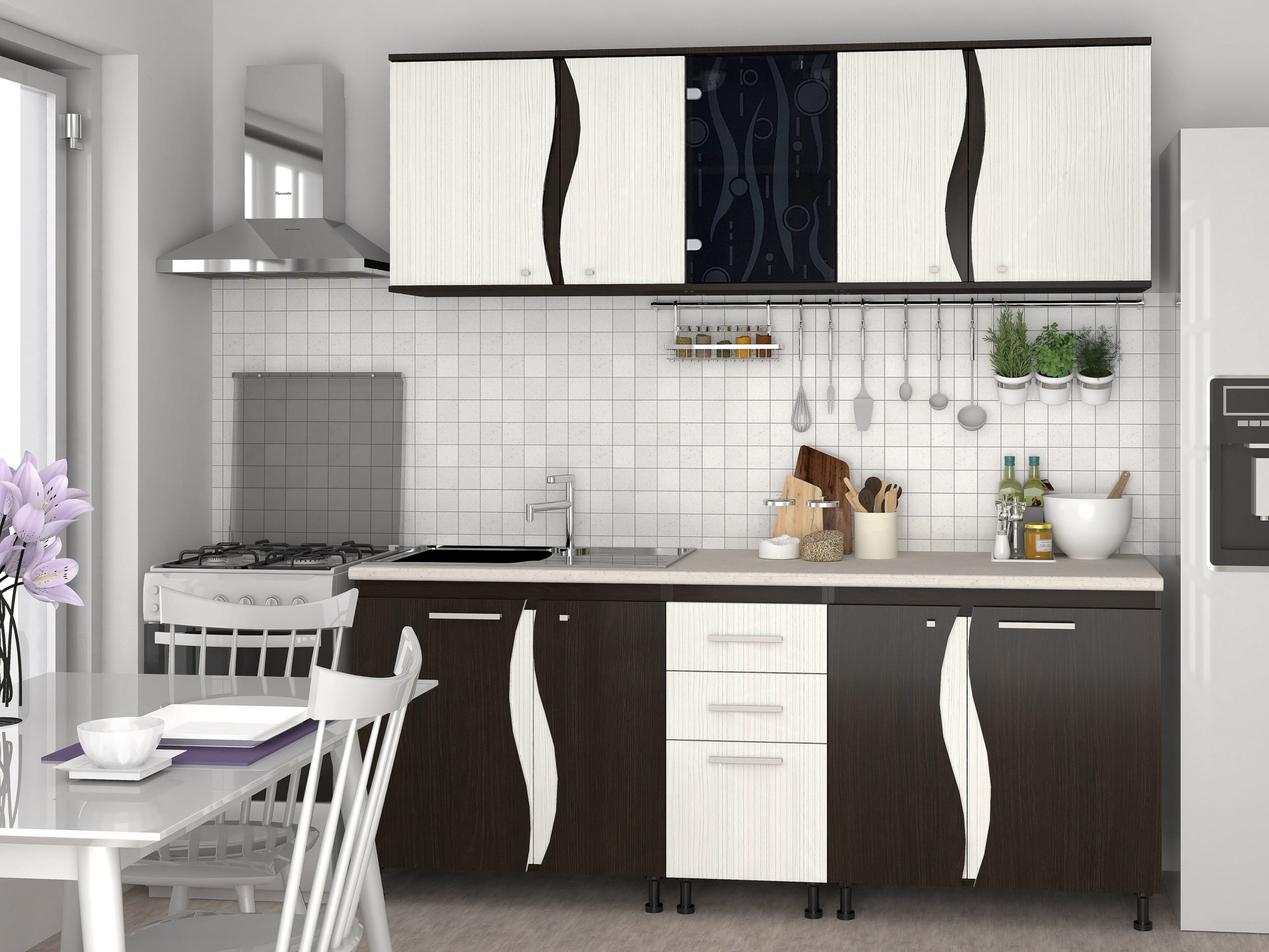 Bucataria este in 2 nuante (PAL Wenge si PAL Alb Hacienda). Partea Inferioara este formata din 3 corpuri (corp de 80 cm cu 2 usi, corp de 40 cm cu sertare si masca de chiuveta) iar partea superioara se compune din 2 corpuri de 80 cm si un corp de 40 cm cu usa geam.