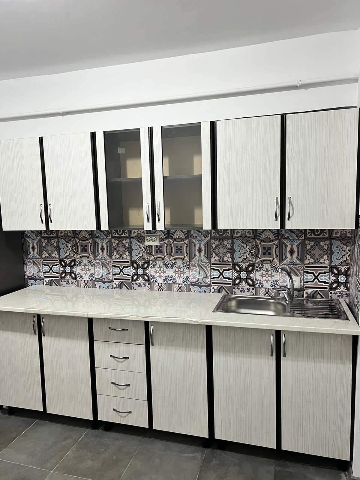 Numarul de dulapuri indica piesele de mobilier care se monteaza individual si formeaza mobila de bucatarie completa. Aceasta este dotata cu 6 corpuri, 3 inferioare si 3 superioare si un blat melaminat.