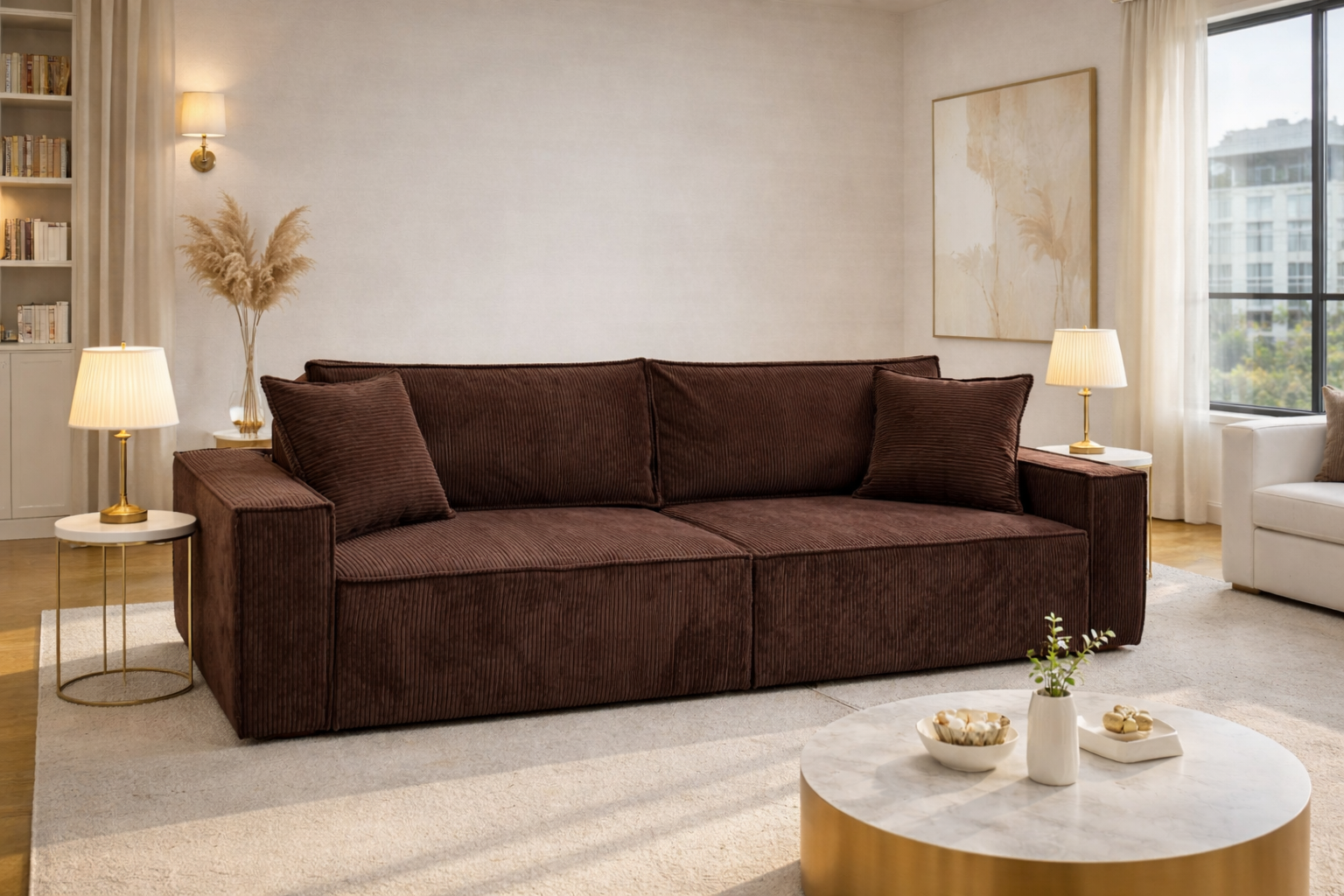 Pernele – 2 mari (100×43 cm) si 2 mici (45×45 cm) sunt fabricate din burete, ceea ce confera un confort superior fata de pernele realizate din burete. Acestea au in plus si doi nasturi care confera un plus de eleganta canapelei.