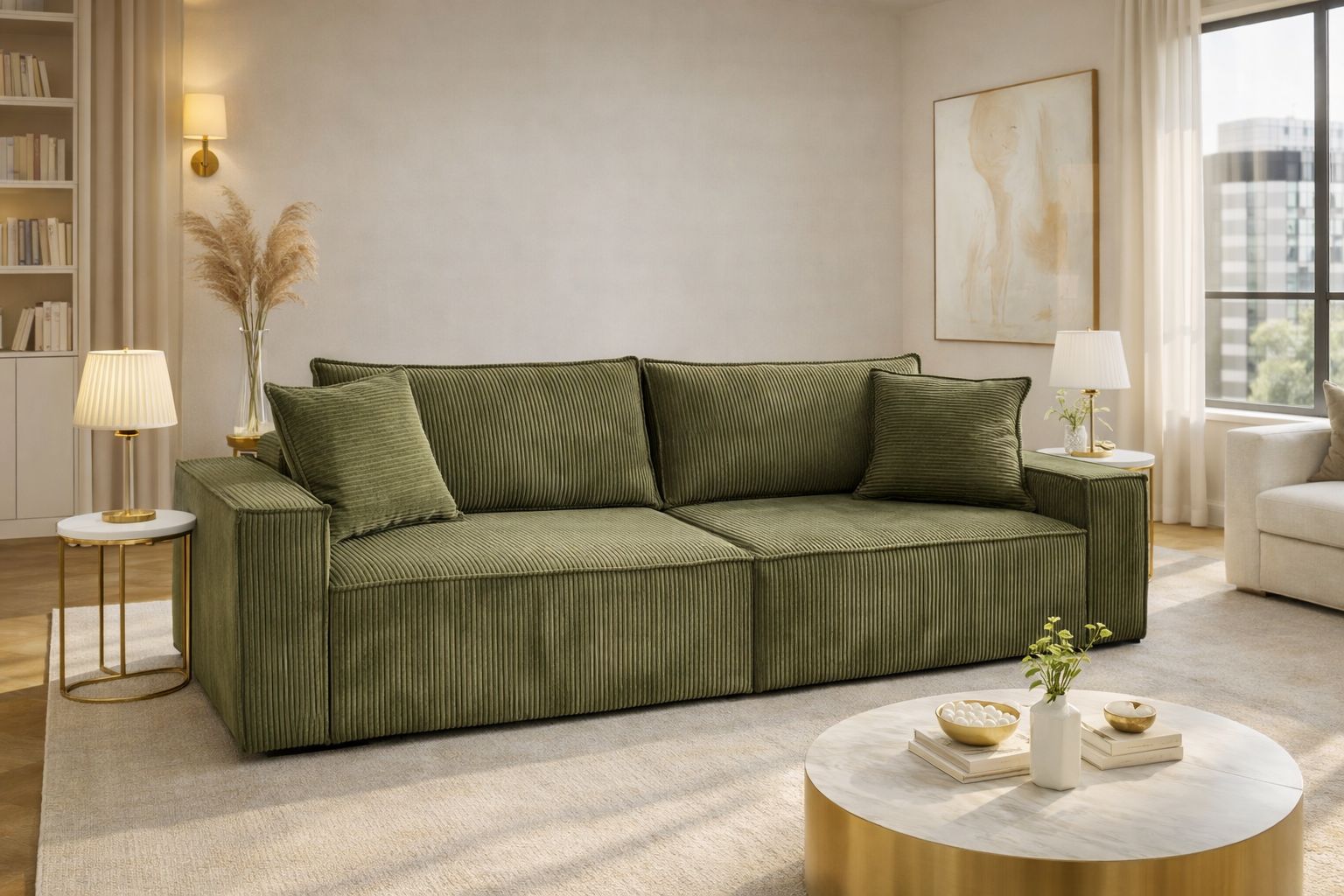 Pernele – 2 mari (100×43 cm) si 2 mici (45×45 cm) sunt fabricate din burete, ceea ce confera un confort superior fata de pernele realizate din burete. Acestea au in plus si doi nasturi care confera un plus de eleganta canapelei.