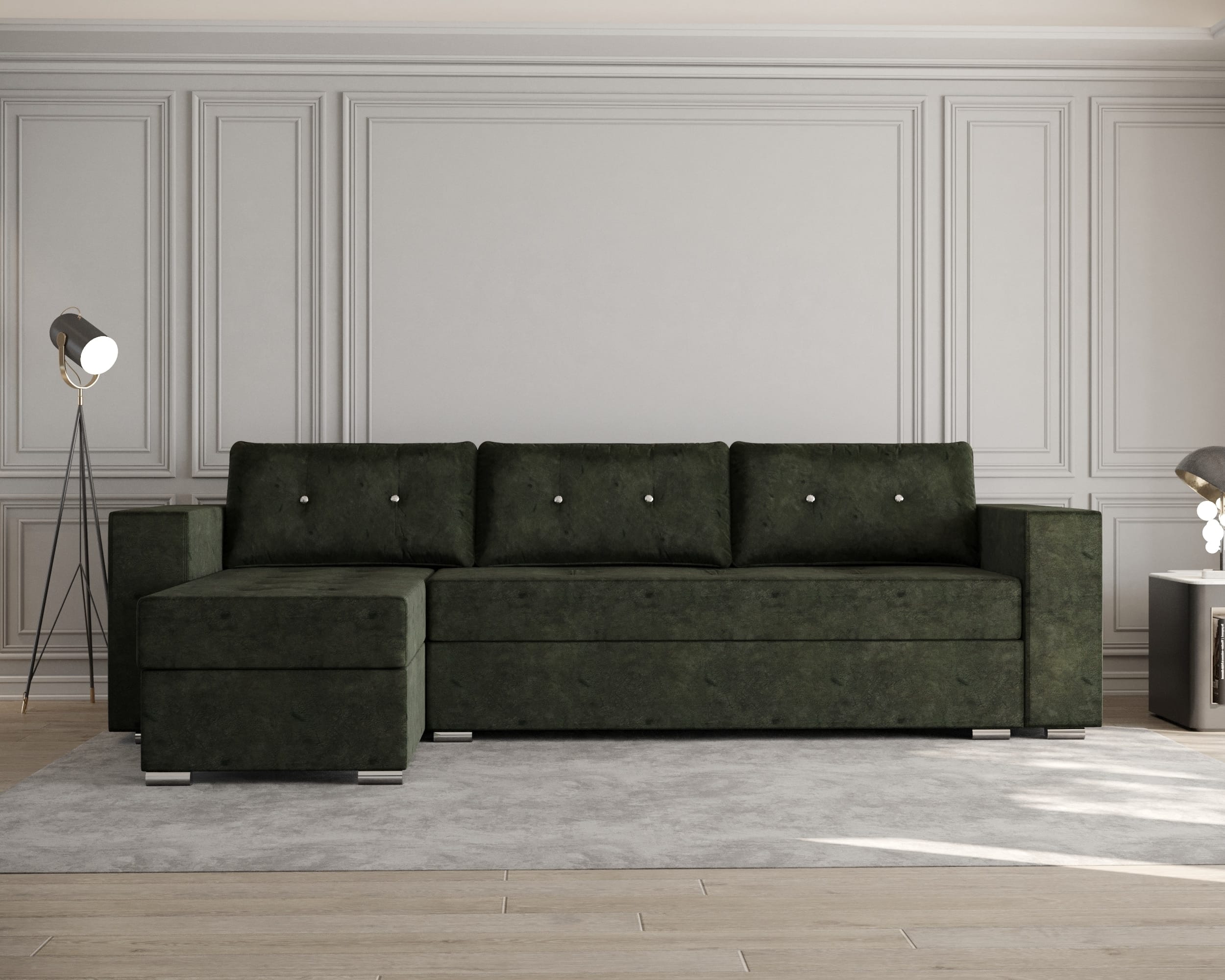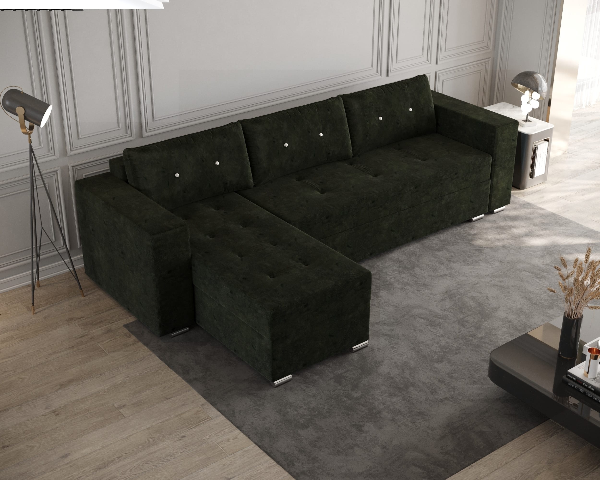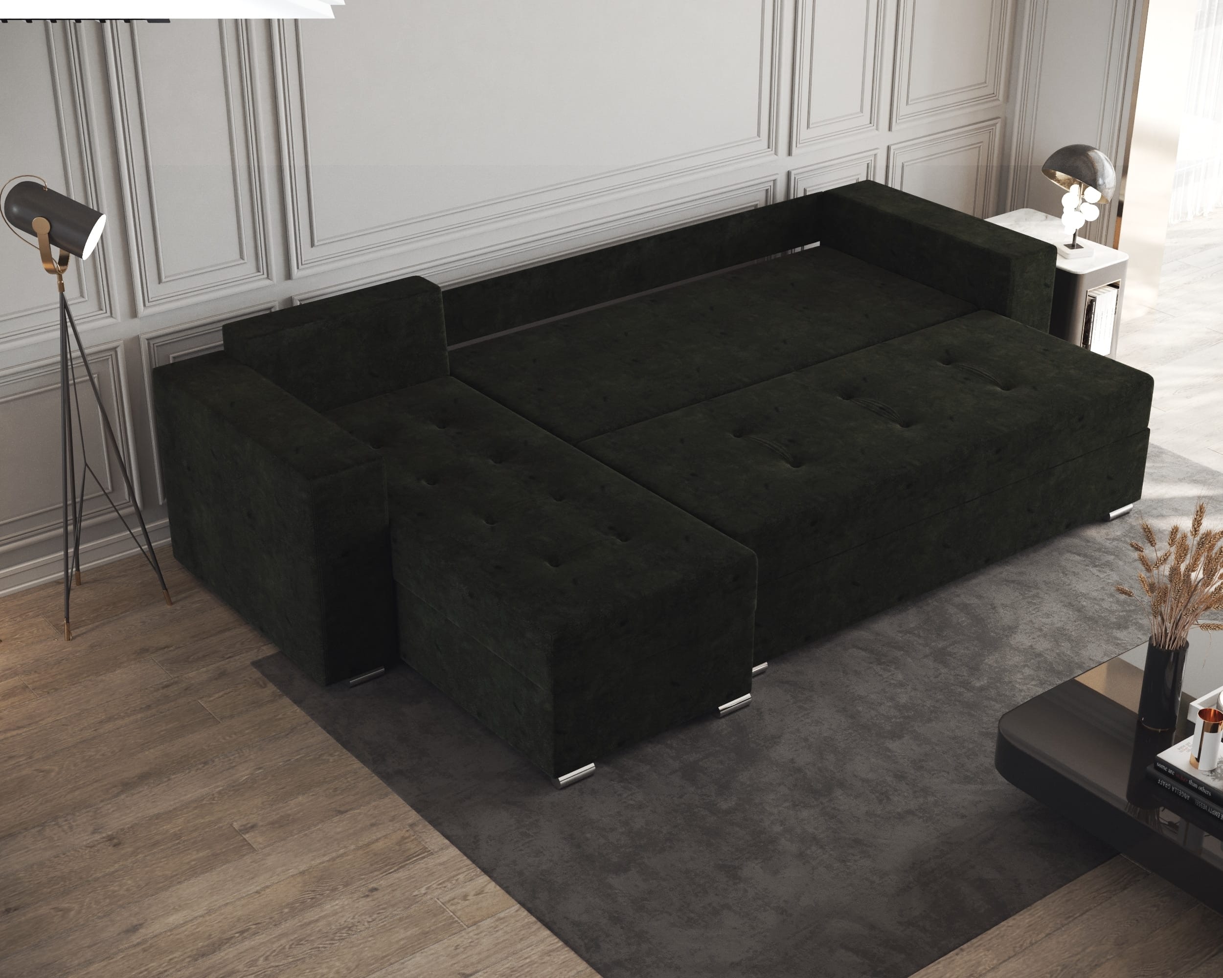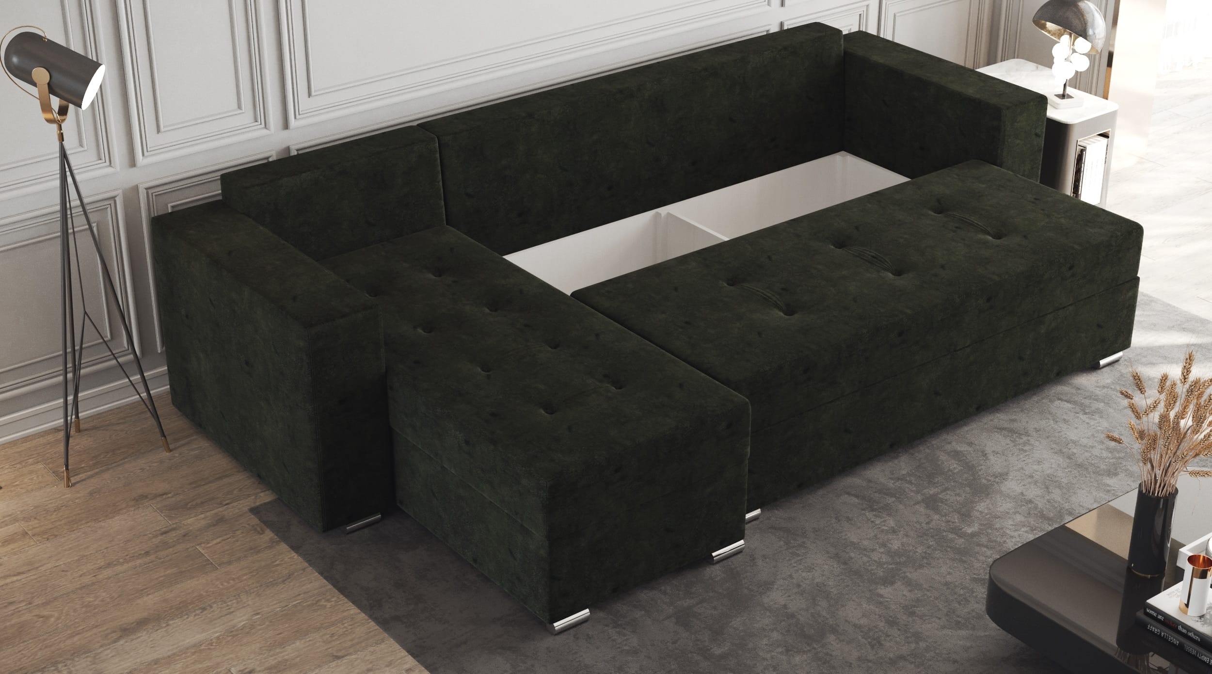 Lada este ideala pentru depozitarea diverselor articole de lenjerie (perne,paturi, etc). Scheletul este rezistent, fiind realizat din pal melaminat si lemn. Coltarul are doua lazi de depozitare, una sub sezutul canapelei si una sub „L”.