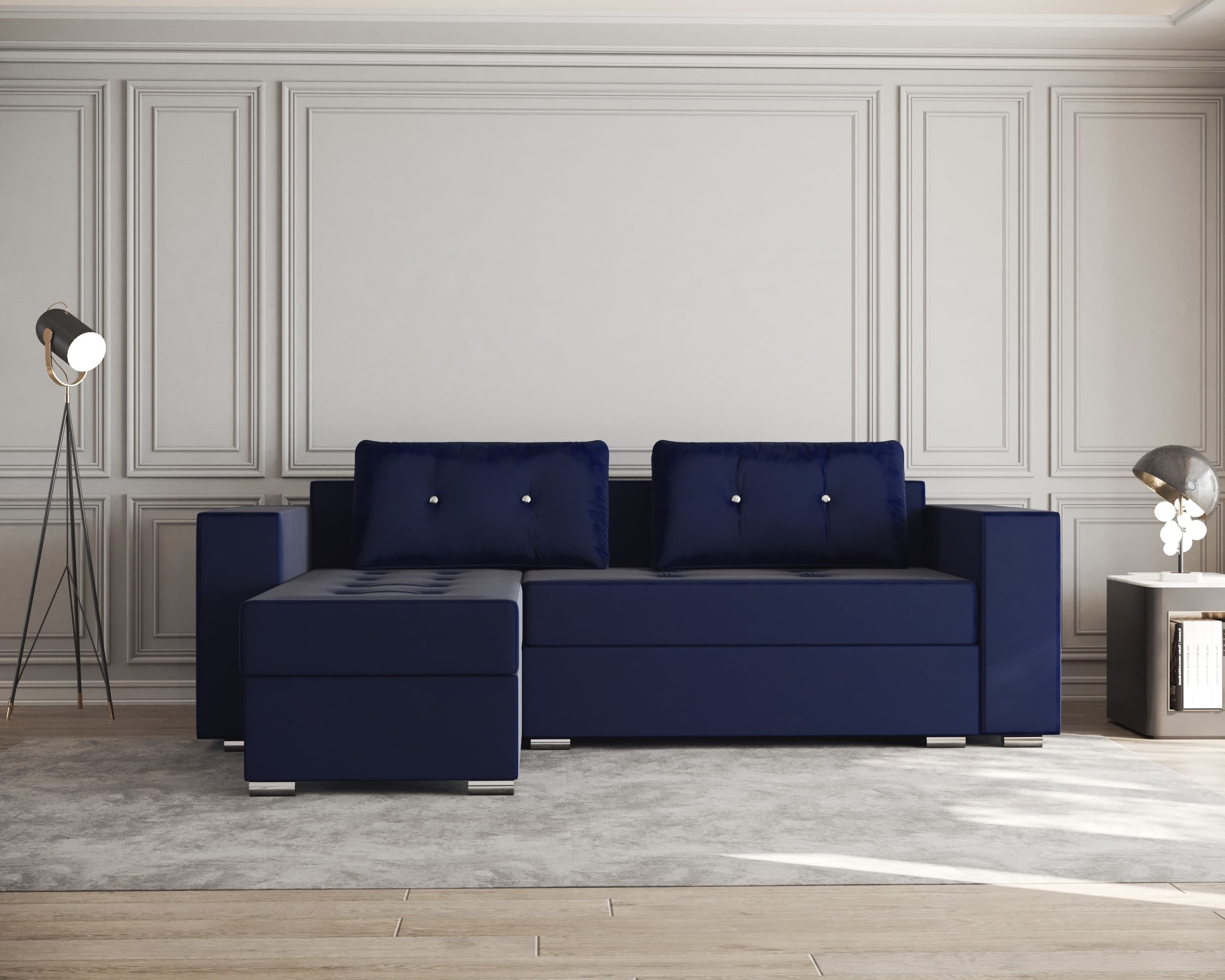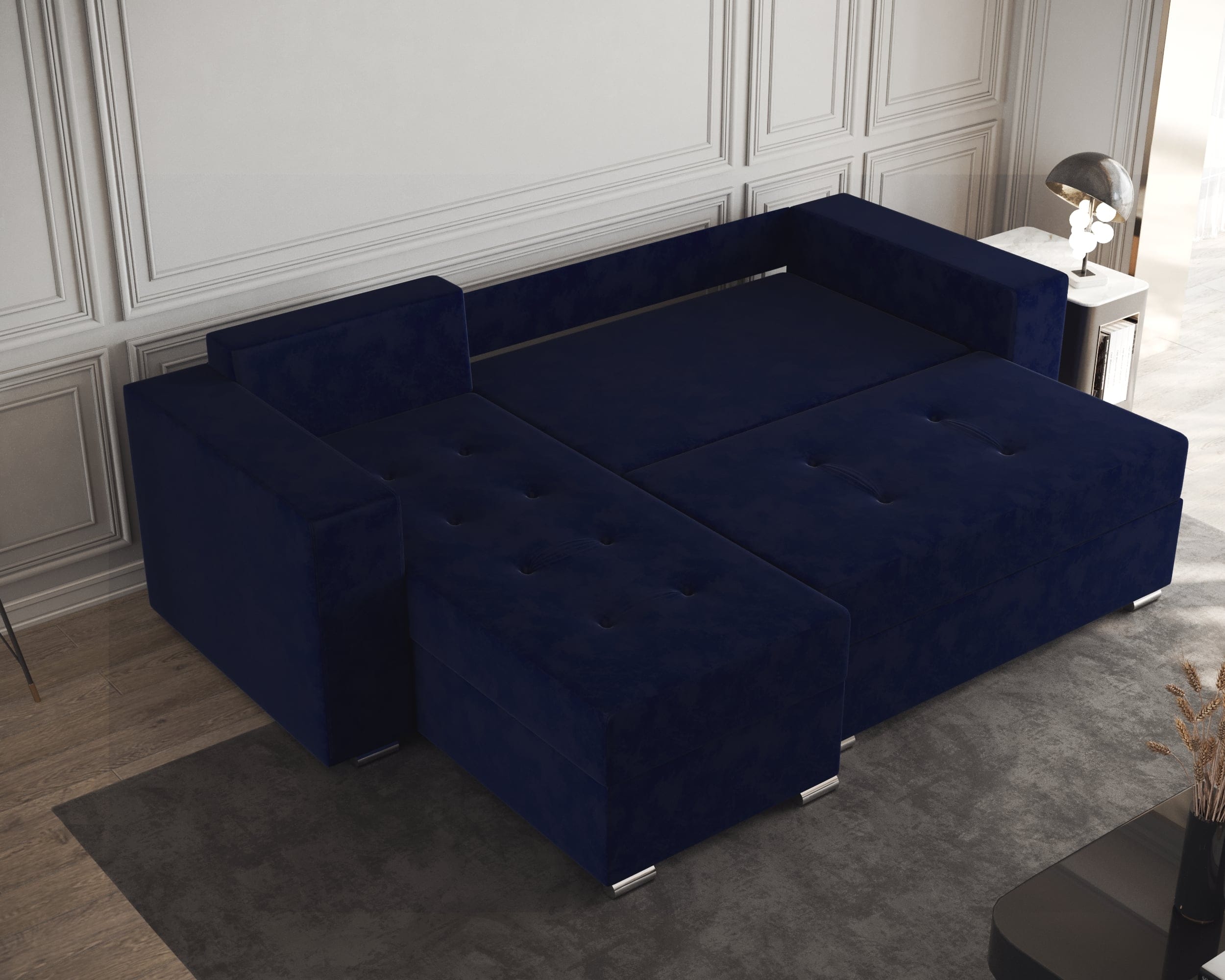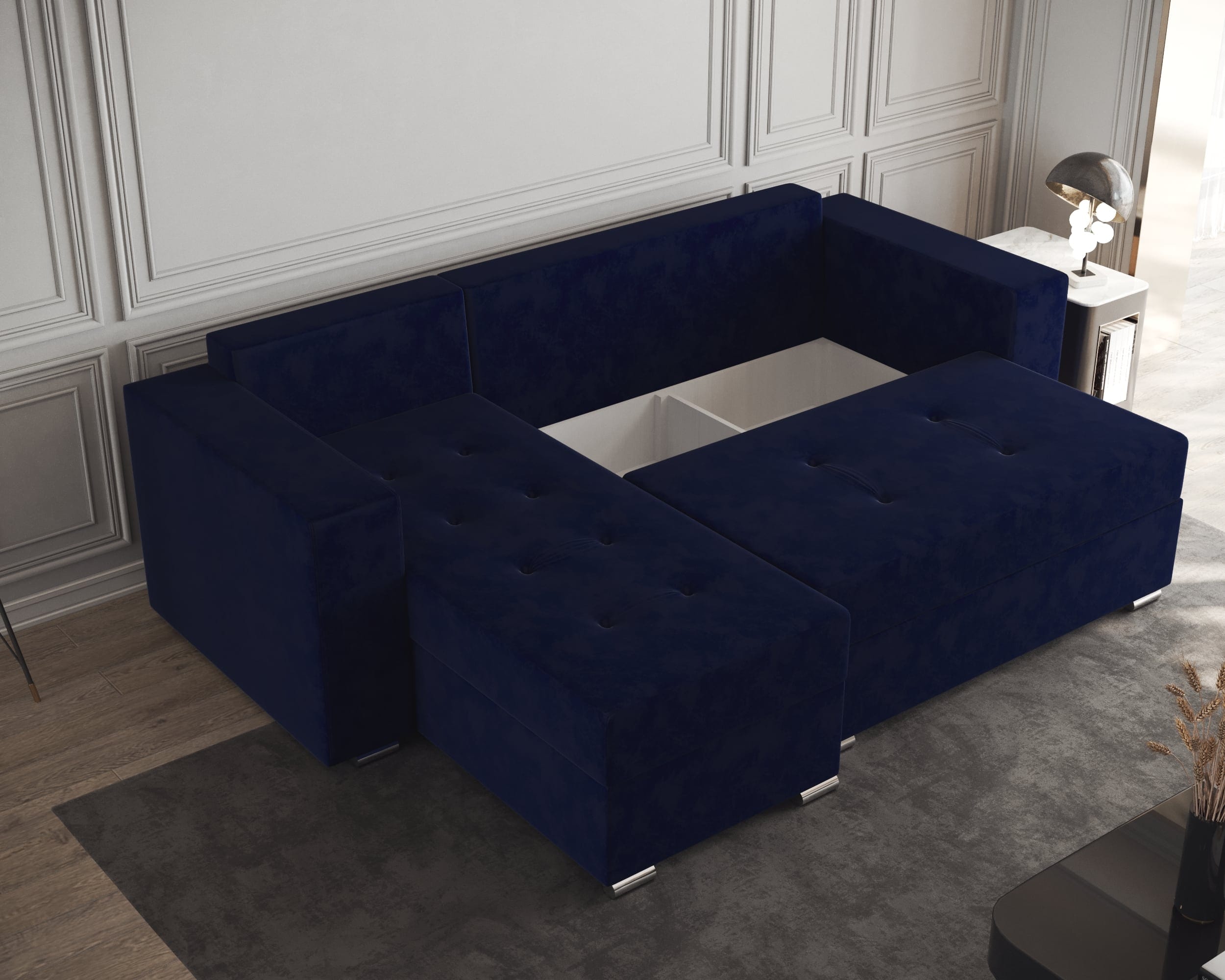 Lada este ideala pentru depozitarea diverselor articole de lenjerie (perne,paturi, etc). Scheletul este rezistent, fiind realizat din pal melaminat si lemn. Coltarul are doua lazi de depozitare, una sub sezutul canapelei si una sub „L”.