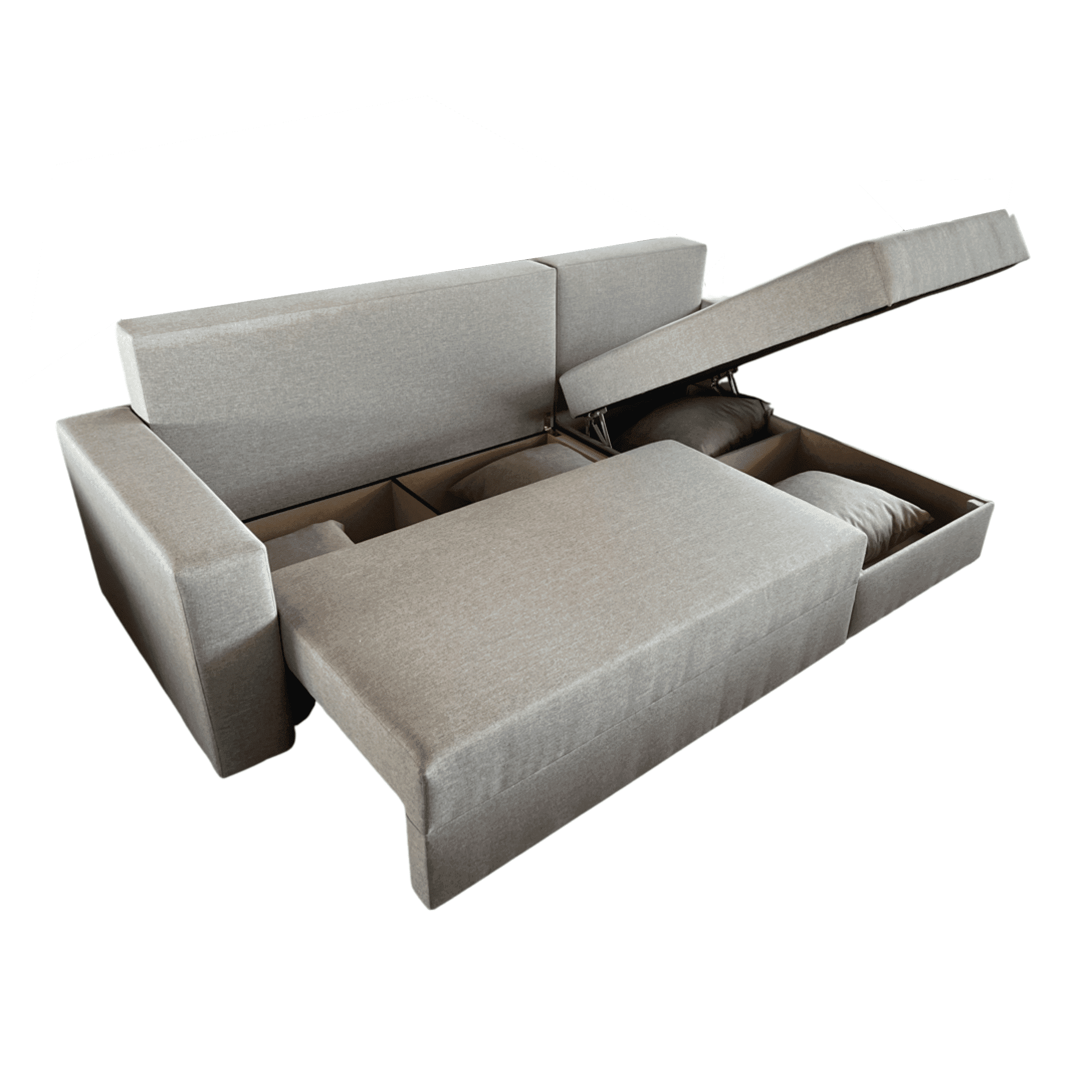 Lada este ideala pentru depozitarea diverselor articole de lenjerie (perne,paturi, etc). Scheletul este rezistent, fiind realizat din pal melaminat si lemn. Coltarul are doua lazi de depozitare, una sub sezutul canapelei si una sub „L”.