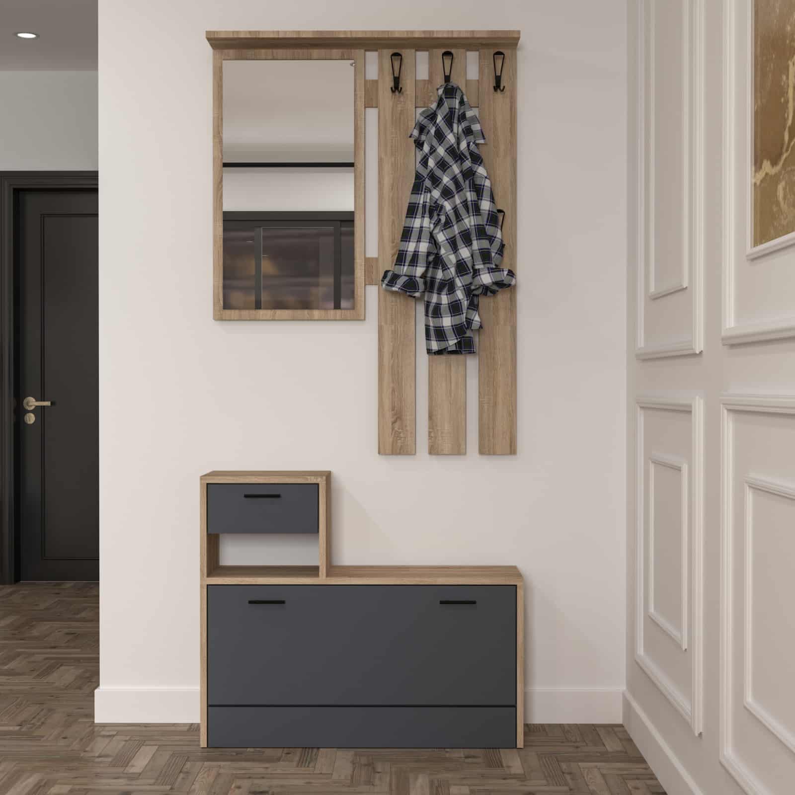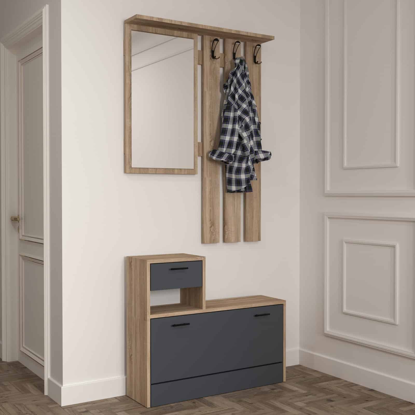 Setul de mobilier pentru hol Filo este realizat din PAL melaminat. Ușa se deschide cu ajutorul unui sistem rabatabil, iar interiorul este organizat cu doua rafturi pentru încălțăminte, fiecare raft având capacitatea de a depozita 3 perechi de pantofi. Dimensiunile acestuia sunt 90 cm lungime, 24 cm adâncime și 191 cm înălțime. Înălțimea este cea recomandată, întrucât partea superioară a cuierului poate fi montată la înălțimea dorită.