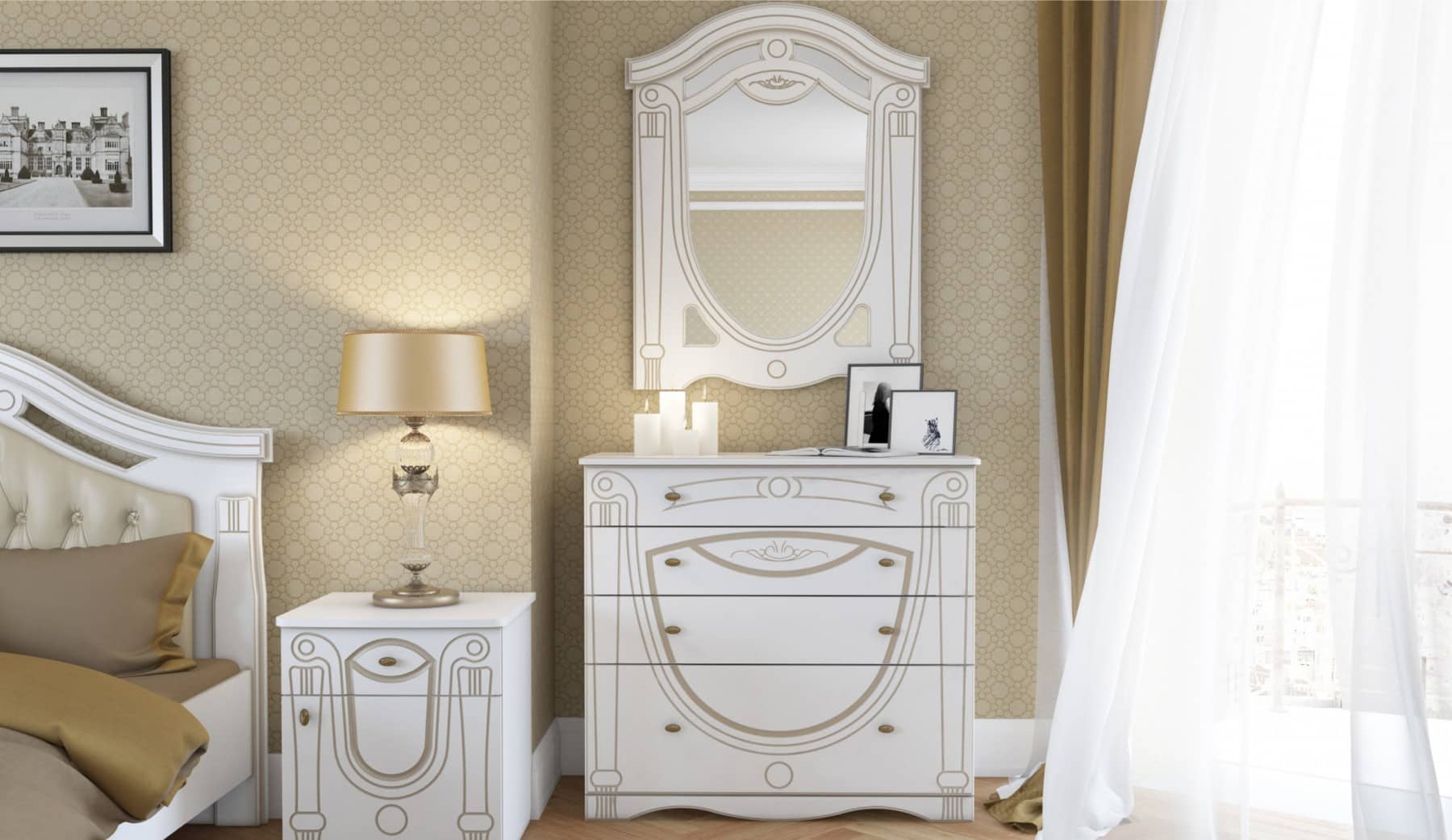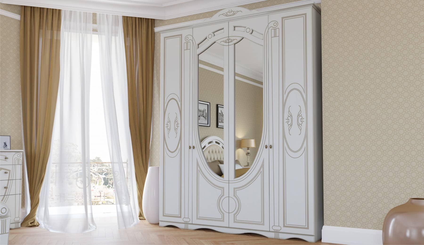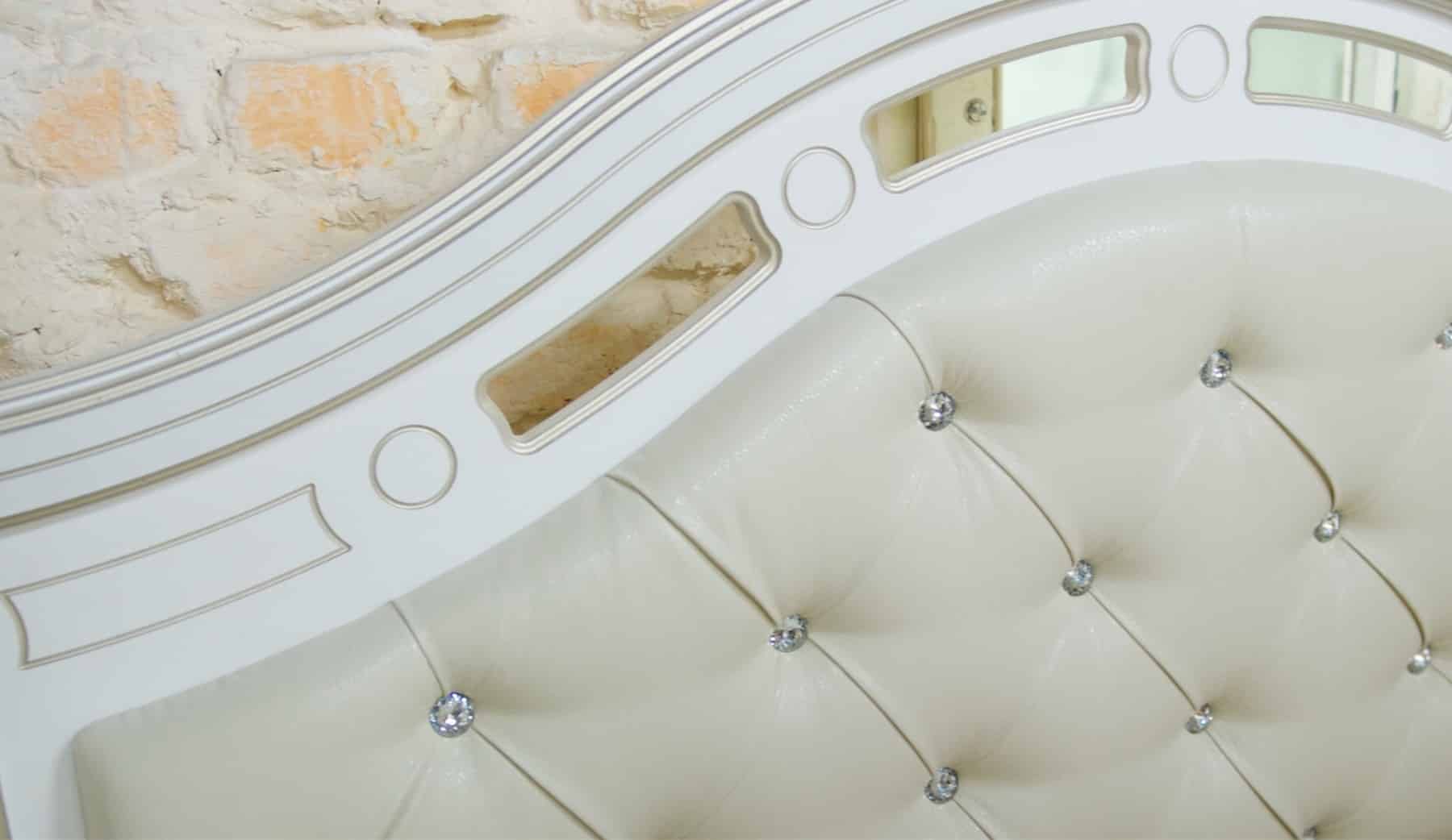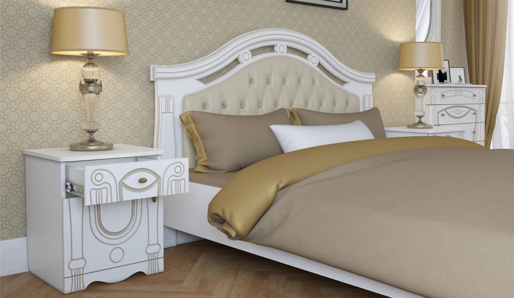 Dormitor Alexandrina 4 usi, Alb & Auriu, tapiterie Crem