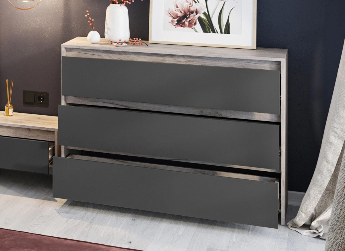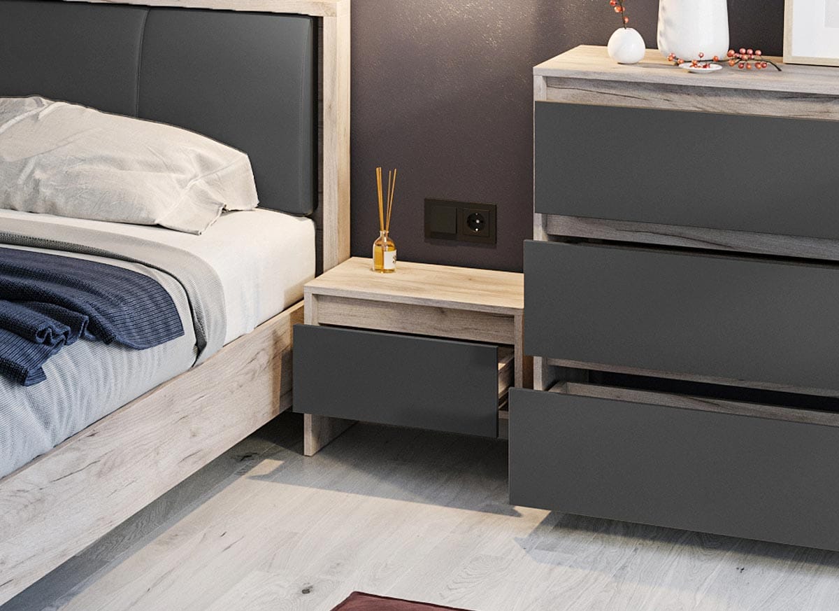 Setul de dormitor Indiko este un dormitor complet format din mai multe piese de mobilier si are un design inedit cu influente scandinave. Acestea sunt fabricate din PAL melaminat de 16 mm in combinatia de culori Gri Antracit si Stejar K02, cel din urma avand o textura similara lemnului. Cantul aplicat este unul de 0,6 care le permite muchiilor sa fie placute la atingere fiind finisate si atent retusate. Usile dulapului sunt glisante cu suport metalic.