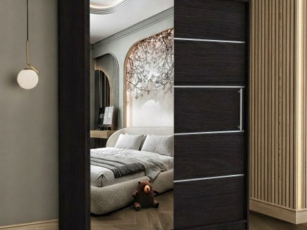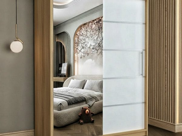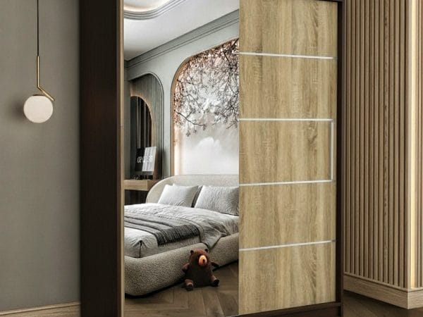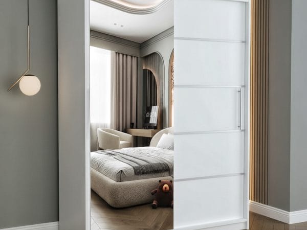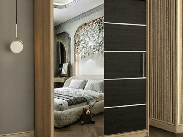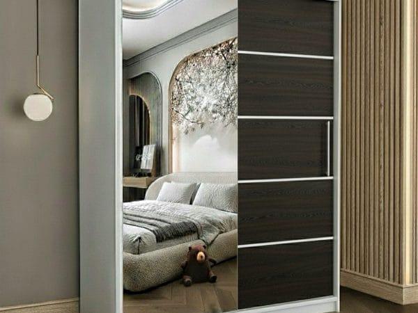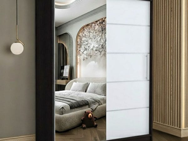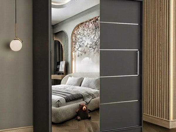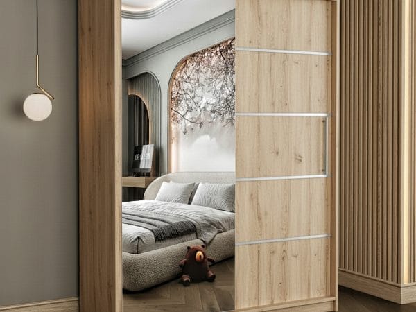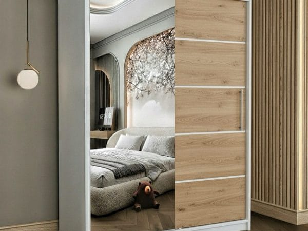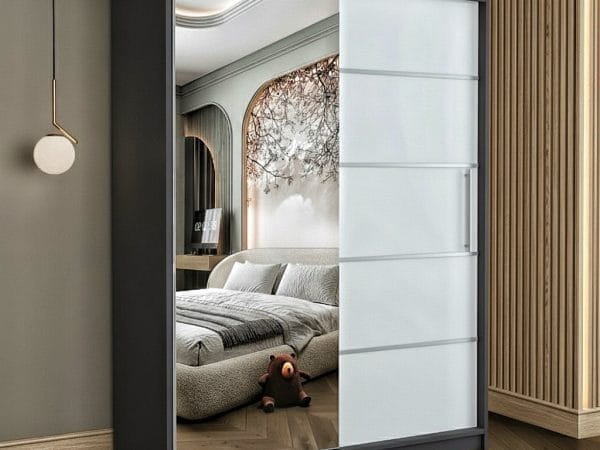 Usile sunt glisante si nu necesita spatiu exterior suplimentar pentru deschidere iar sistemul de glisare este metalic. Rolul oglinzii este pe langa utilitatea sa de baza, de a creea senzatia de camera marita si spatioasa. Dulapul are benzi decorative aplicate pe usa fara oglinda, cu scopul de a da un design modern si actual.
