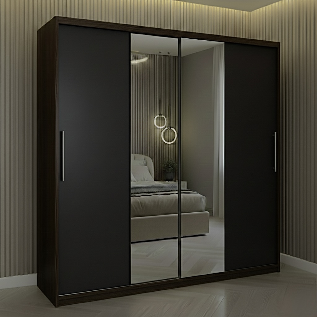 Usile sunt glisante si nu necesita spatiu exterior suplimentar pentru deschidere iar sistemul de glisare este metalic. Rolul oglinzii impartite pe cele 2 usi este pe langa utilitatea sa de baza, de a creea senzatia de camera marita si spatioasa.