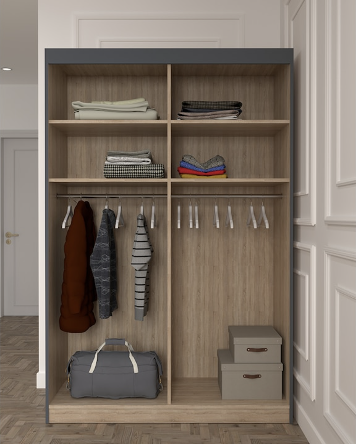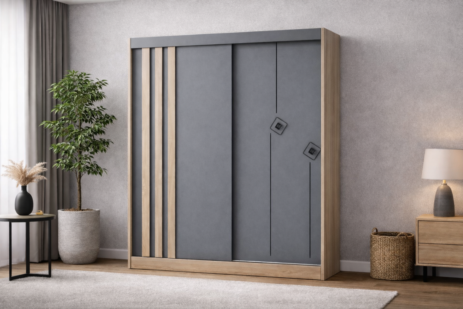 - Deschiderea dulapului se face prin glisare stanga-dreapta, cu ajutorul unui sistem de culisare