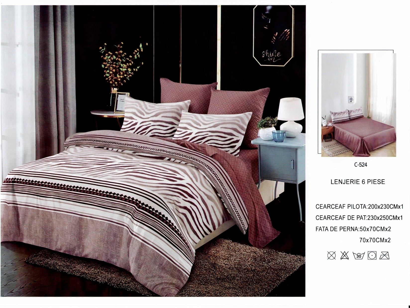 Lenjeriile au o tesatura fina si placuta la atingere. Va pot oferi confortul de care aveți nevoie în fiecare clipă, iar datorita rezistentei si calitatii tesaturii si imprimarii, pot fi folosite o perioada lunga de timp, fara a-si modifica culorile sau caracteristicile. Materialul din care este confectionata lenjeria este de calitate superioara cu o textura fina, moale, foarte placuta la atingere si tratat antisifonare.