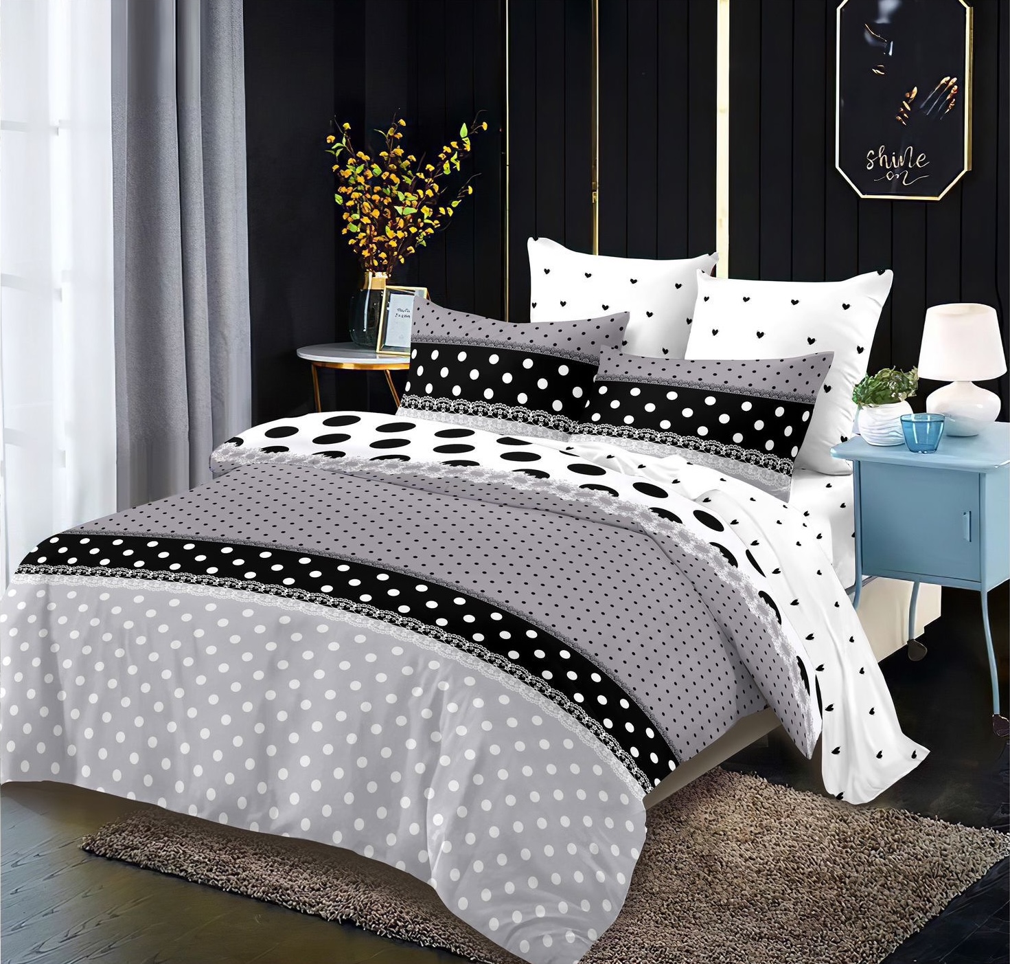 Lenjeriile au o tesatura fina si placuta la atingere. Va pot oferi confortul de care aveți nevoie în fiecare clipă, iar datorita rezistentei si calitatii tesaturii si imprimarii, pot fi folosite o perioada lunga de timp, fara a-si modifica culorile sau caracteristicile. Materialul din care este confectionata lenjeria este de calitate superioara cu o textura fina, moale, foarte placuta la atingere si tratat antisifonare.