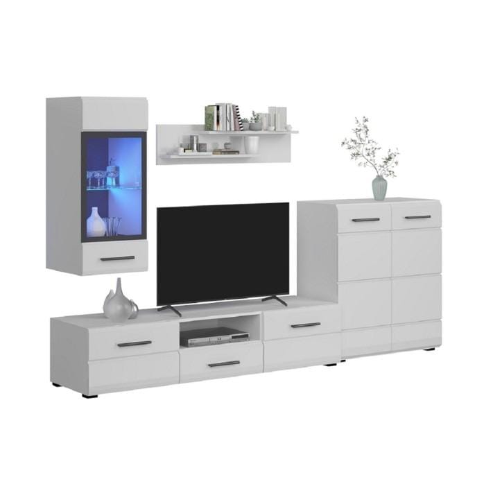 Living-ul Alaska este realizat într-un stil minimalist. Liniile austere, laconice, subliniază eleganța setului. Mobilierul alb cu detalii de negru intens va face camera mai luminoasă vizual, mai spațioasă și vă va permite să creați un set de mobilier cu un stil impecabil. Combinația de suprafețe lucioase și de sticlă si rafturi deschise va crea o atmosferă confortabilă și vă va permite să decorați camera cu obiecte mici precum cartile sau fotografiile preferate. Un suport TV larg cu sertare pe ghidaje telescopice vă va permite să plasați comod un televizor cu orice diagonală și alte dispozitive media.
