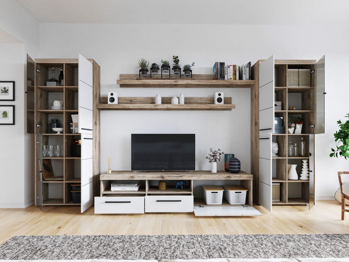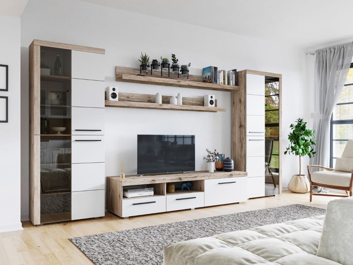 Mobila de sufragerie Bueno 2 are 5 corpuri modulare – 2 suspendate si 3 nesuspendate si spatii de depozitare cu usa, cat si etajere si polite: