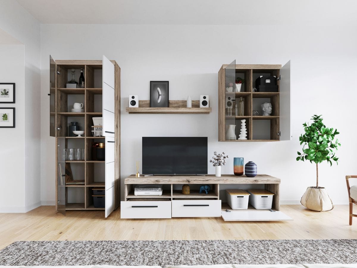 Mobila de sufragerie Bueno 6 are 4 corpuri modulare – 2 suspendate si 2 nesuspendate si spatii de depozitare cu usa, cat si etajere si polite:
