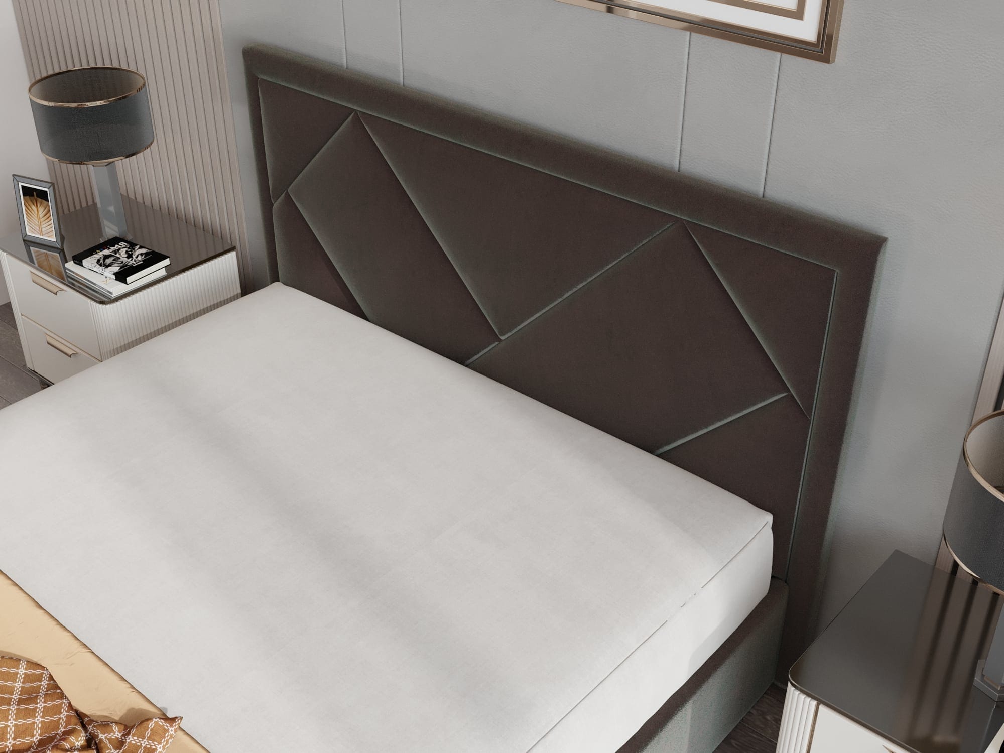 Este realizat din materiale de calitate, are o structura din PAL melaminat, iar tablia este tapitata cu un material textil catifelat. Patul este prevazut cu cromate, elegante, cu o inaltime de 3 cm.