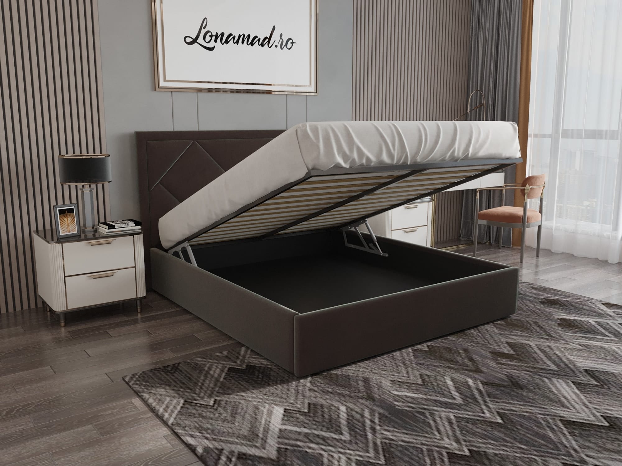Pat tapitat cu lada de depozitare Santiago, Maro catifea