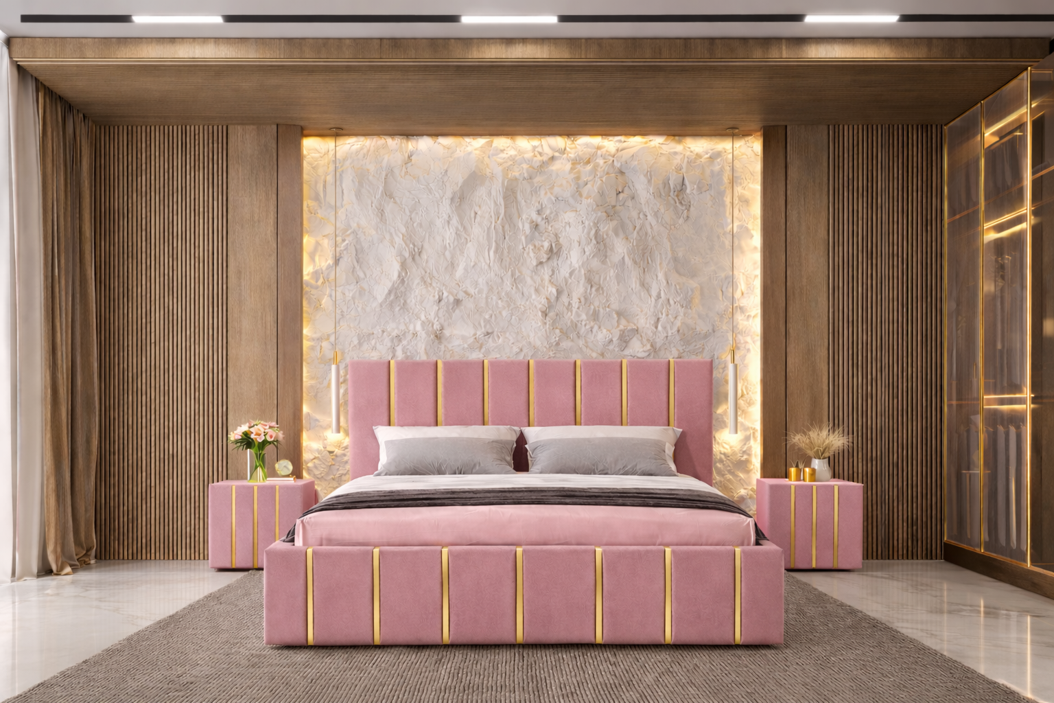 Pat tapitat Hugo 140×200 cm,Roz+ Saltea Superortopedica Gold, grosime 20 cm + Set 2 noptiere Hugo, Roz