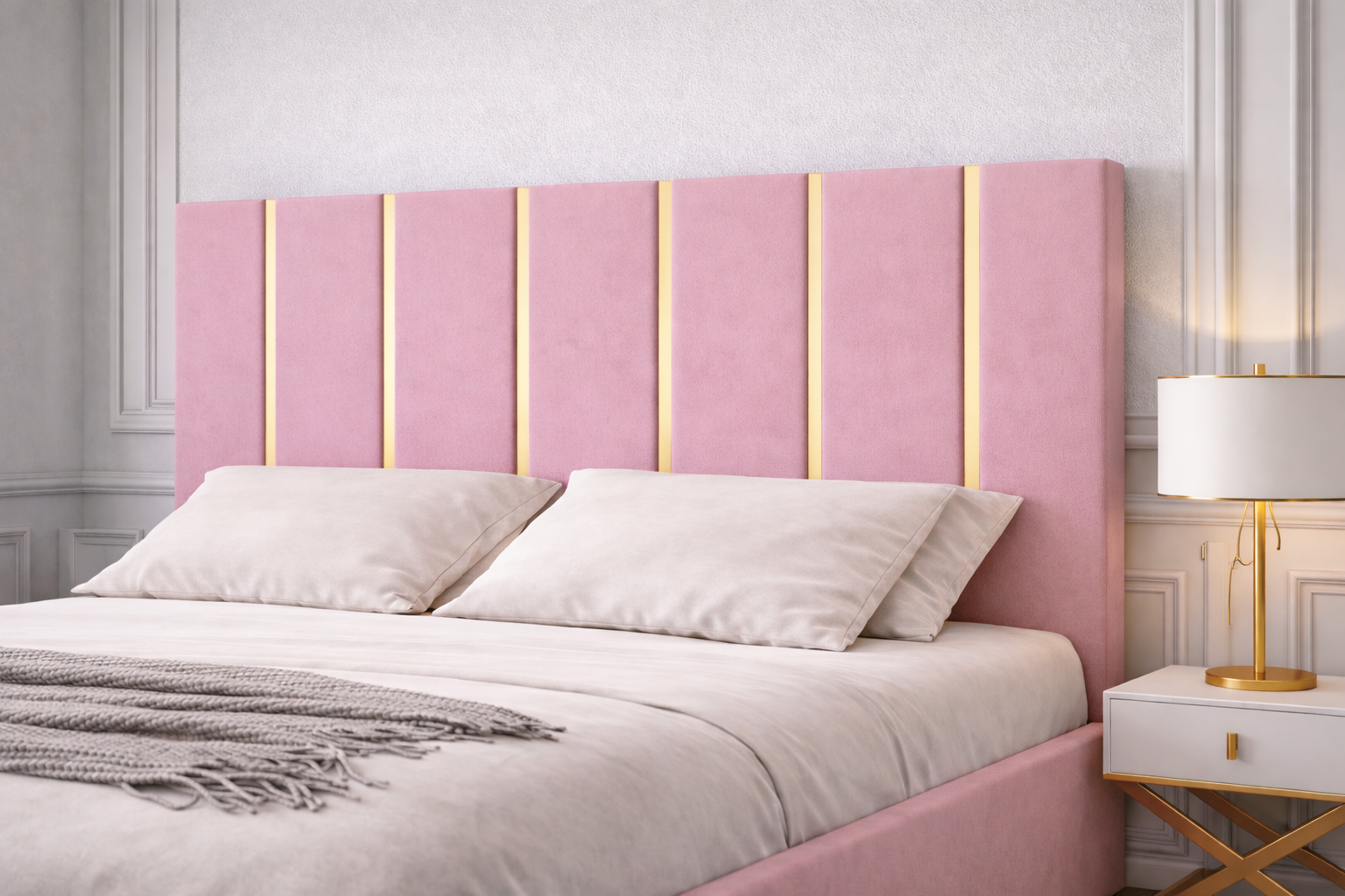 Este realizat din materiale de calitate, are o structura din PAL melaminat, iar tablia este tapitata cu un material textil catifelat. Atat pe tablia mare, cat si pe cea mica sunt aplicate benzi de culoare aurie, numarul lor fiind diferit in functie de dimensiunea patului. Patul este prevazut cu picioare dreptunghiulare din plastic cu inaltimea de 2,5 cm.