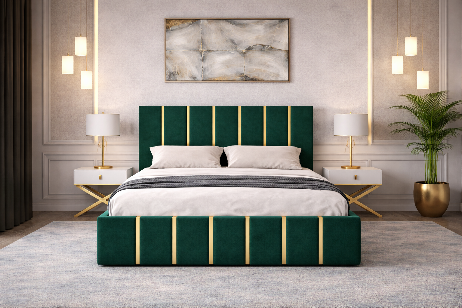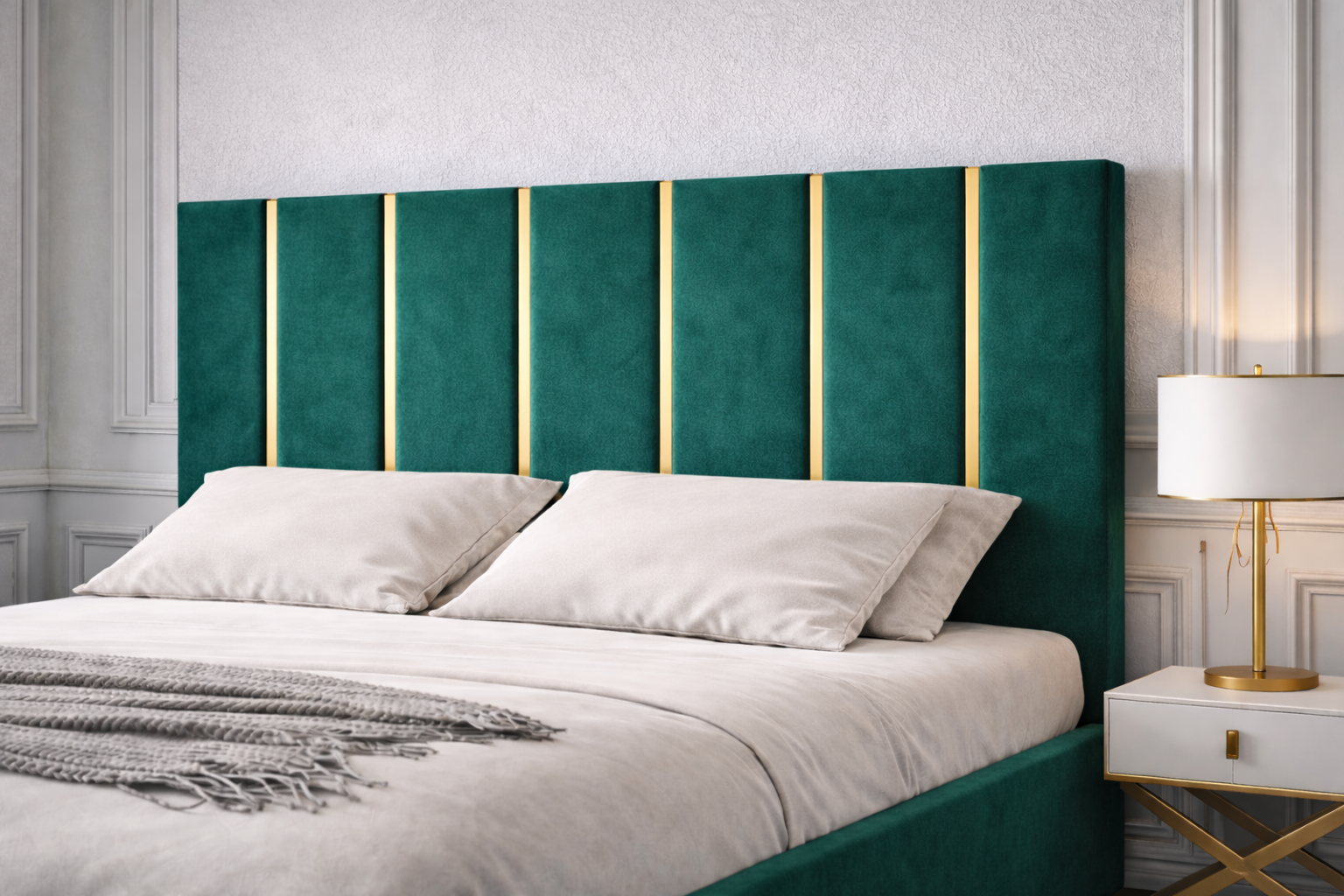 Este realizat din materiale de calitate, are o structura din PAL melaminat, iar tablia este tapitata cu un material textil catifelat. Atat pe tablia mare, cat si pe cea mica sunt aplicate benzi de culoare aurie, numarul lor fiind diferit in functie de dimensiunea patului. Patul este prevazut cu picioare dreptunghiulare din plastic cu inaltimea de 2,5 cm.