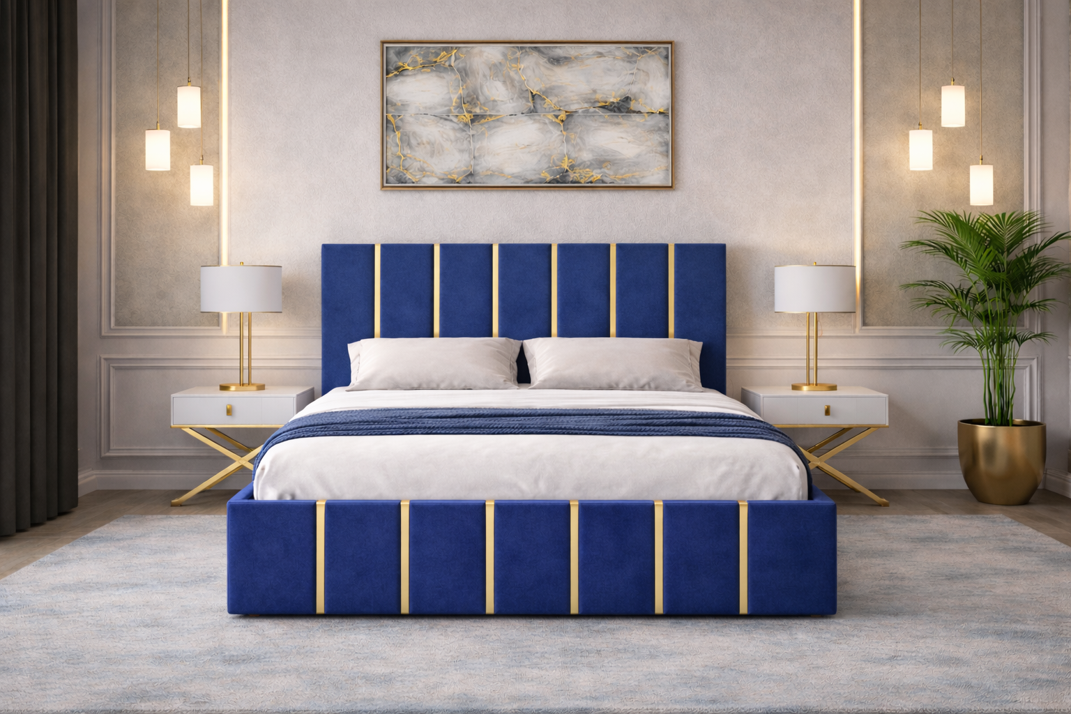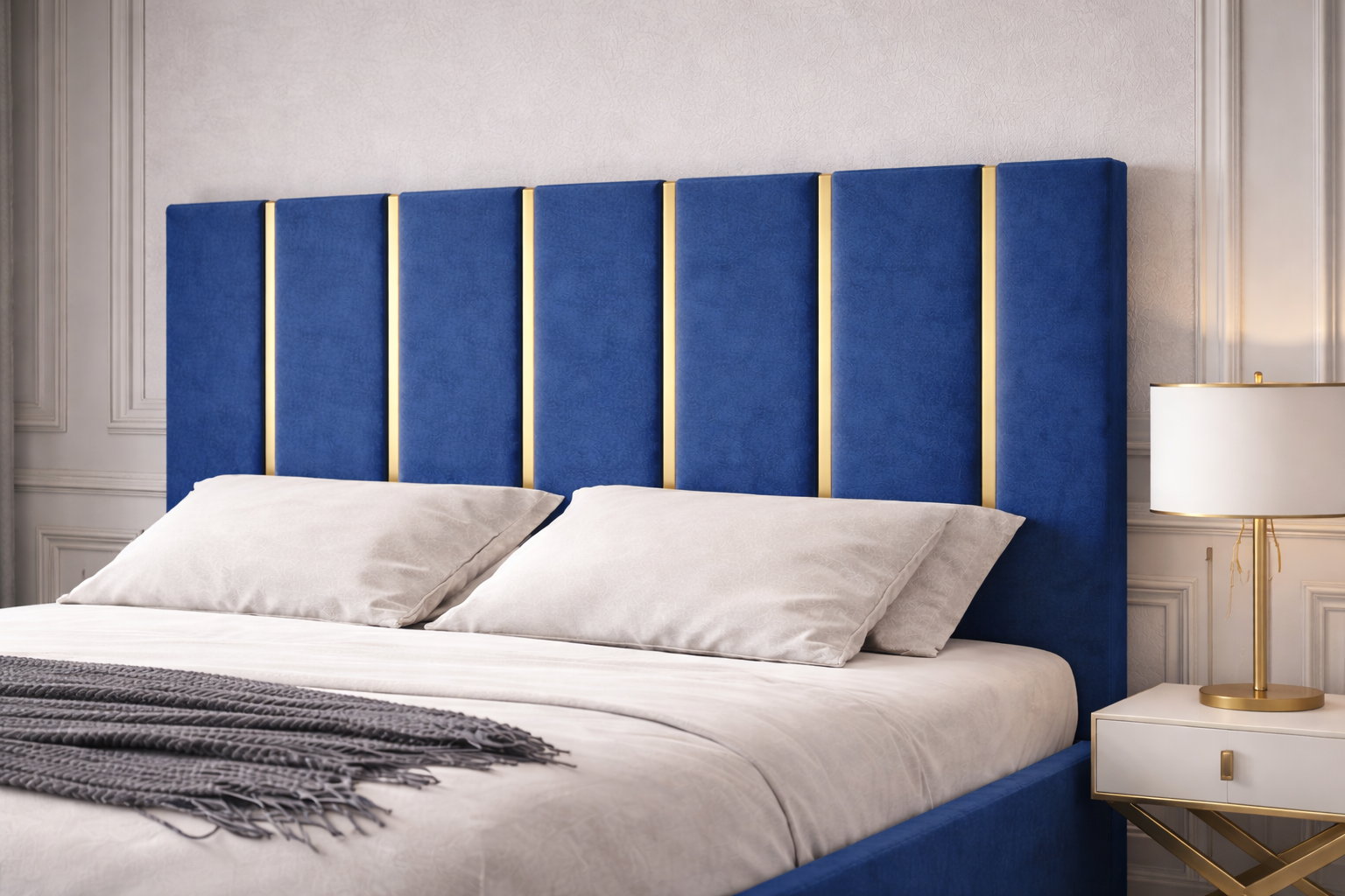 Este realizat din materiale de calitate, are o structura din PAL melaminat, iar tablia este tapitata cu un material textil catifelat. Atat pe tablia mare, cat si pe cea mica sunt aplicate benzi de culoare aurie, numarul lor fiind diferit in functie de dimensiunea patului. Patul este prevazut cu picioare dreptunghiulare din plastic cu inaltimea de 2,5 cm.