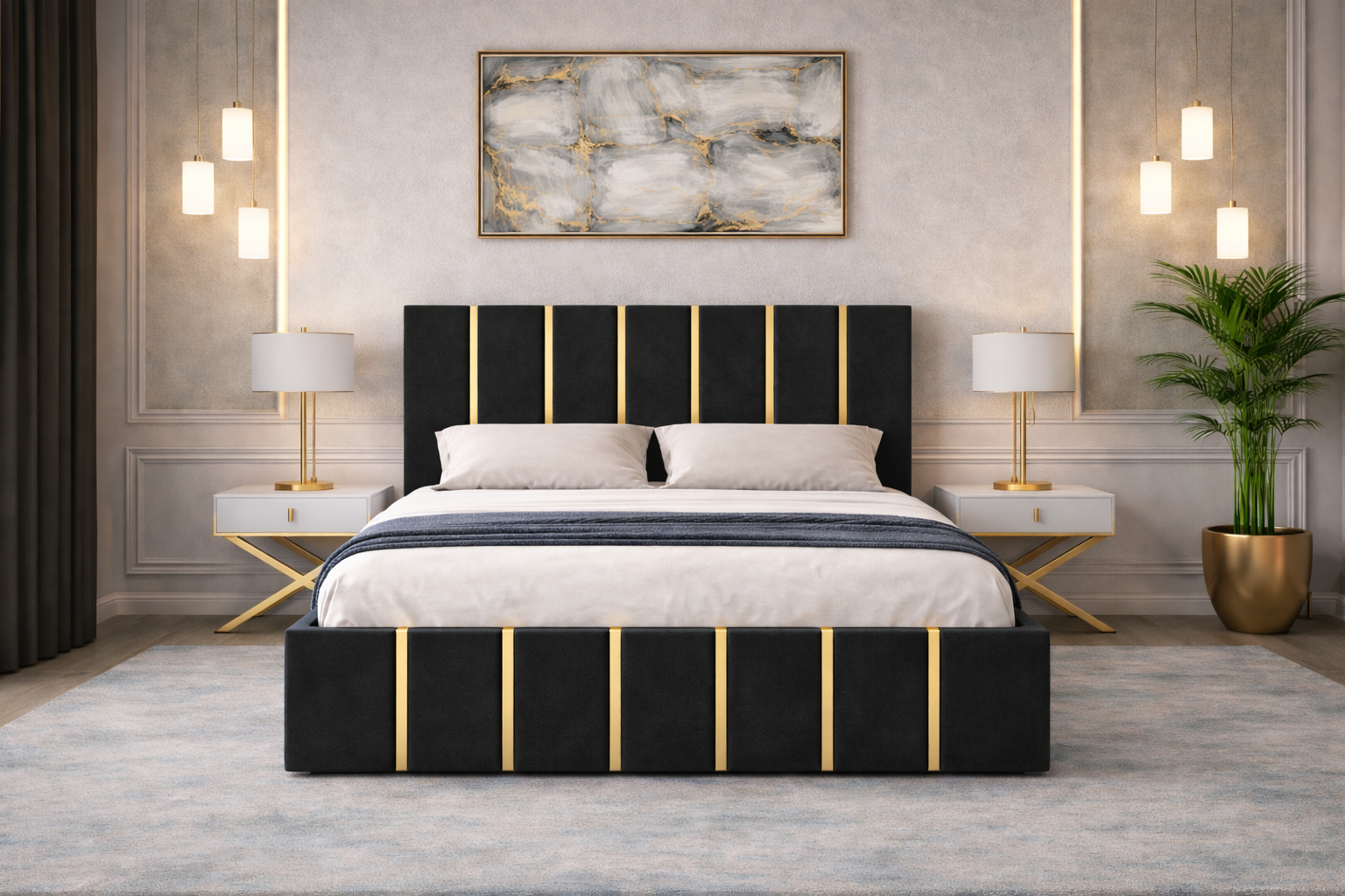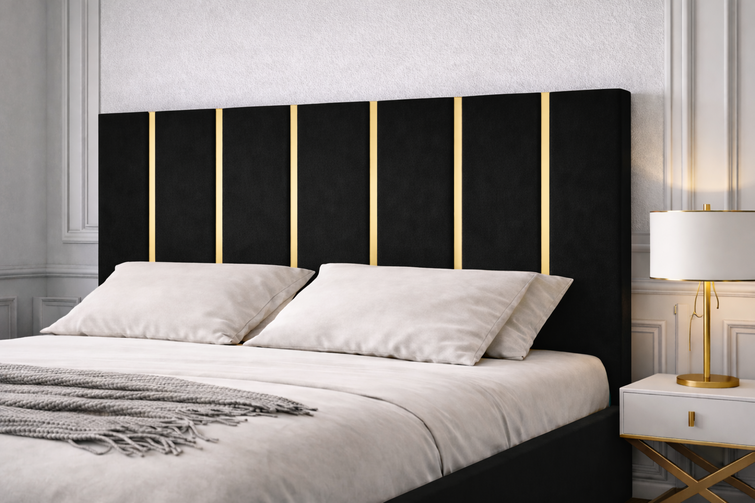 Este realizat din materiale de calitate, are o structura din PAL melaminat, iar tablia este tapitata cu un material textil catifelat. Atat pe tablia mare, cat si pe cea mica sunt aplicate benzi de culoare aurie, numarul lor fiind diferit in functie de dimensiunea patului. Patul este prevazut cu picioare dreptunghiulare din plastic cu inaltimea de 2,5 cm.