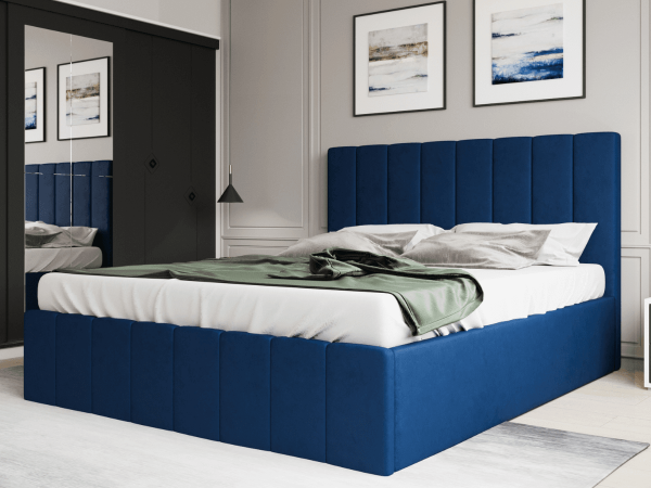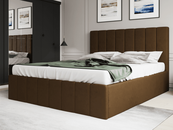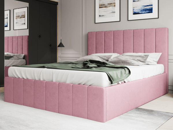 Este realizat din materiale de calitate, are o structura din PAL melaminat, iar tablia este tapitata cu un material textil catifelat. Patul este prevazut cu picioare dreptunghiulare din plastic cu inaltimea de 2,5 cm.