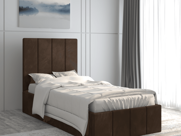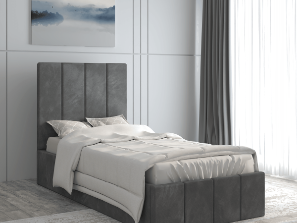 Este realizat din materiale de calitate, are o structura din PAL melaminat, iar tablia este tapitata cu un material textil catifelat. Patul este prevazut cu picioare dreptunghiulare din plastic cu inaltimea de 2,5 cm.