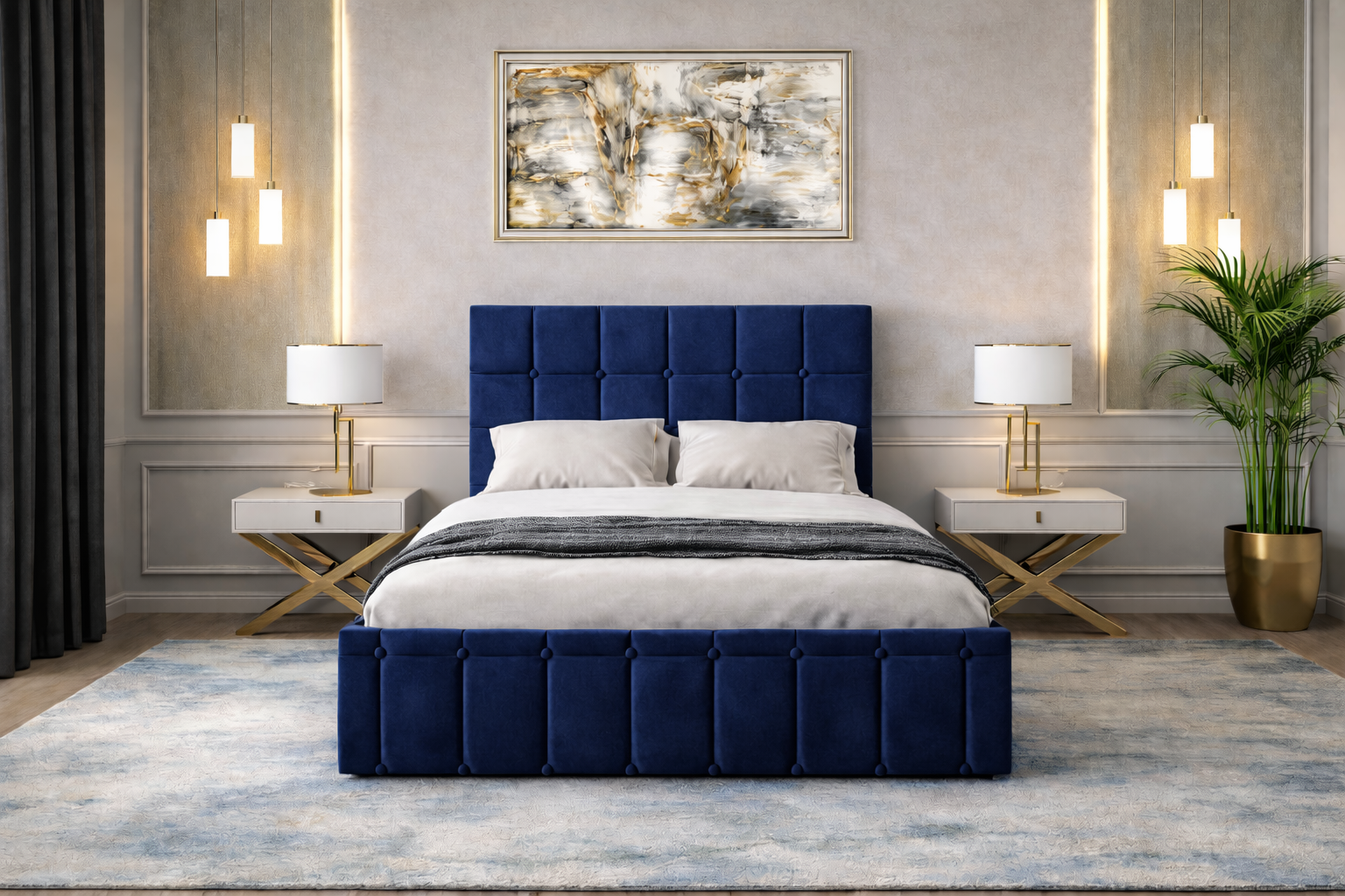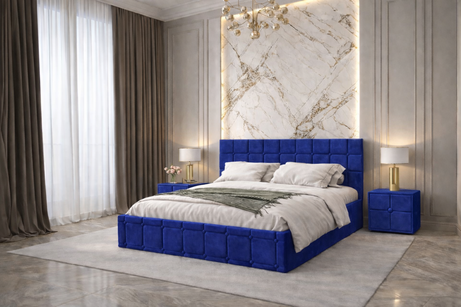 Pat tapitat Royal 140×200 cm, Albastru + Saltea Superortopedica Gold, grosime 20 cm + Set 2 noptiere Royal, Albastru