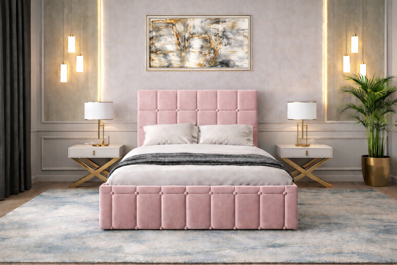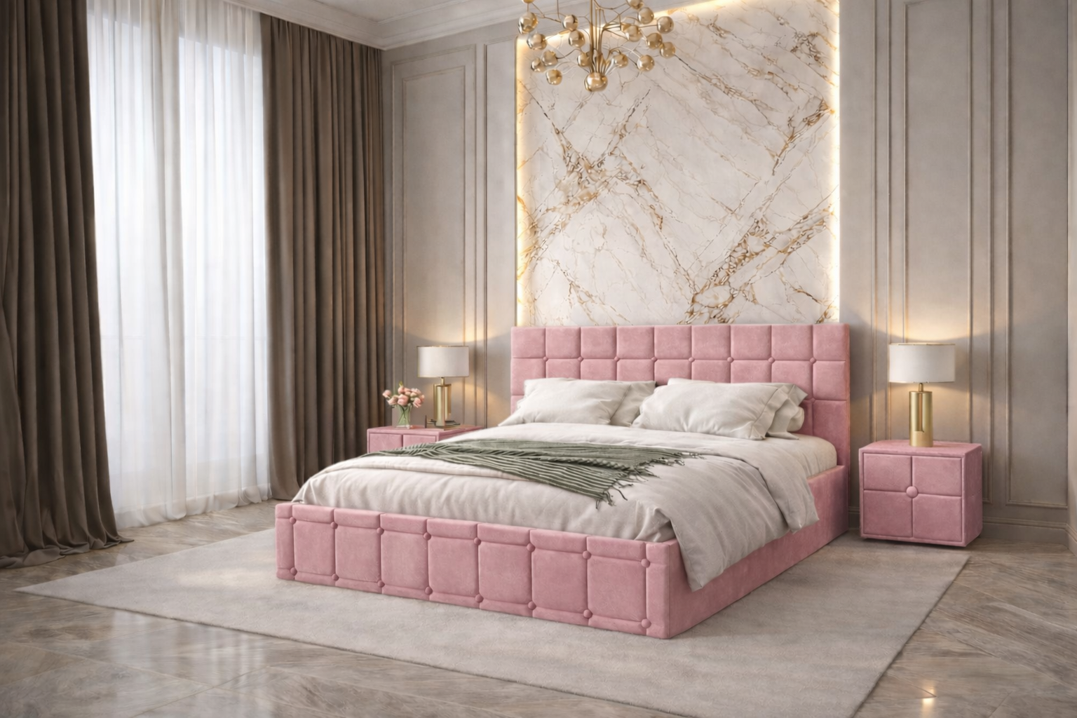 Pat tapitat Royal 160×200 cm, Roz + Saltea Superortopedica Gold, grosime 20 cm + Set 2 noptiere Royal, Roz