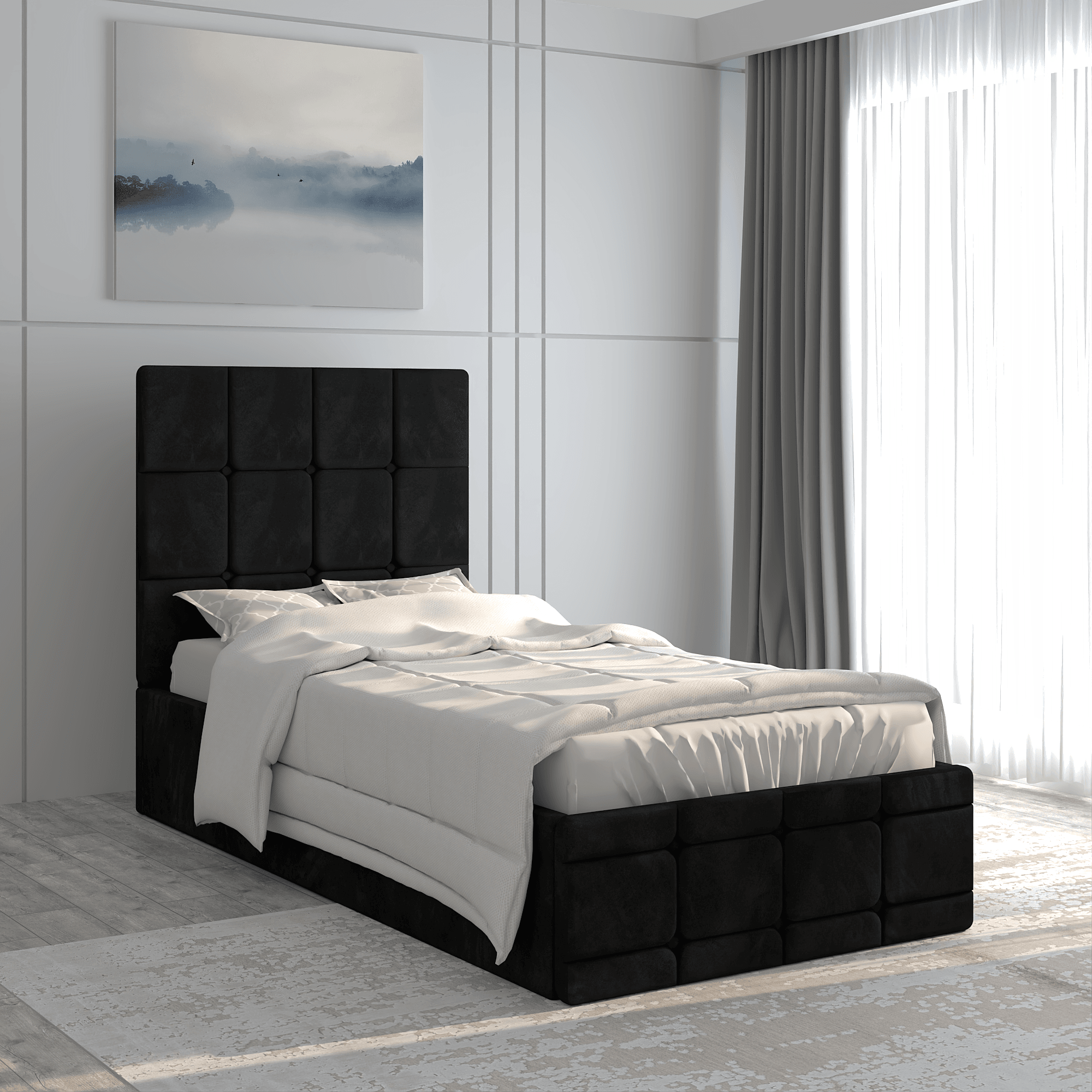 Este realizat din materiale de calitate, are o structura din PAL melaminat, iar tablia este tapitata cu un material textil catifelat. Patul este prevazut cu picioare dreptunghiulare din plastic cu inaltimea de 2,5 cm.