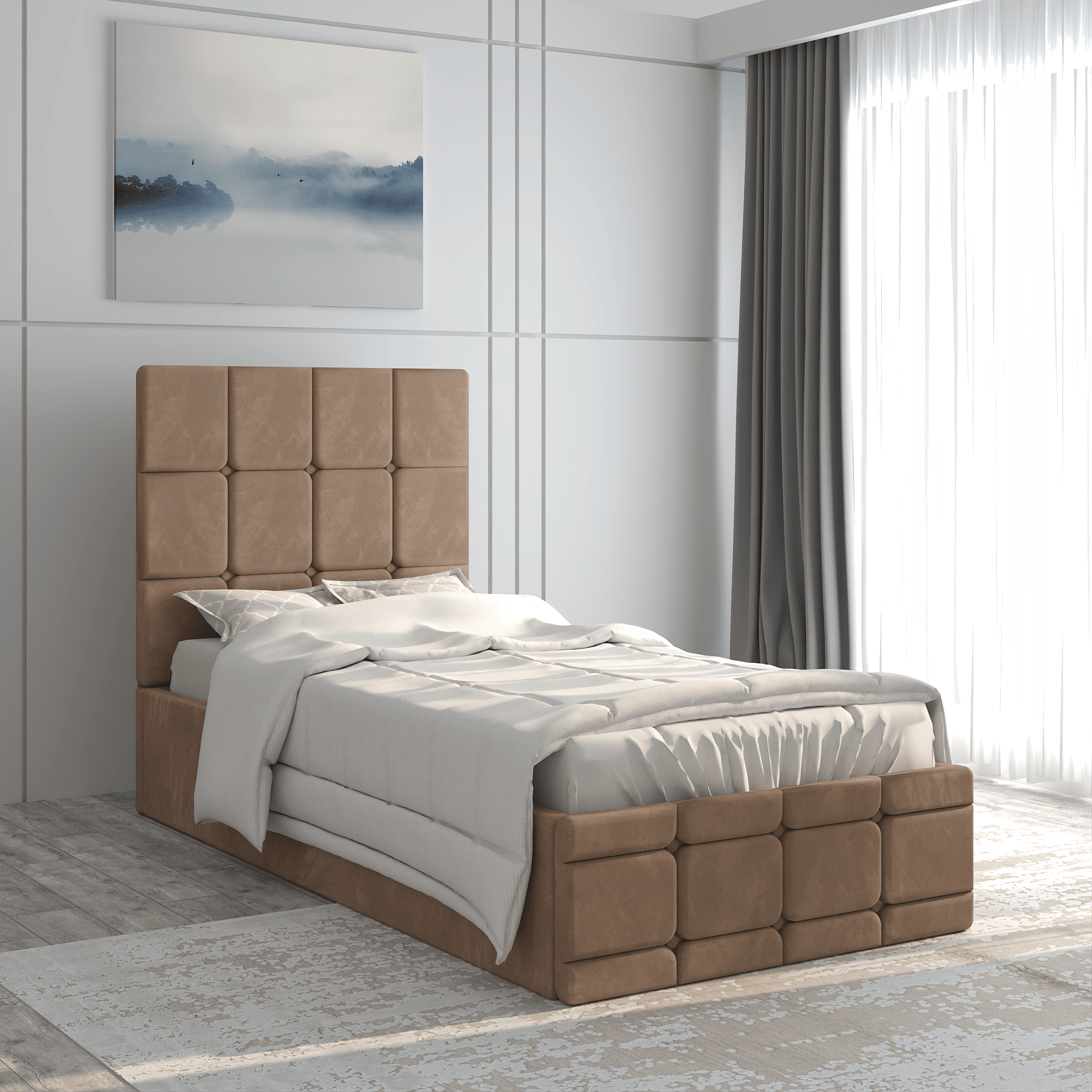 Este realizat din materiale de calitate, are o structura din PAL melaminat, iar tablia este tapitata cu un material textil catifelat. Patul este prevazut cu picioare dreptunghiulare din plastic cu inaltimea de 2,5 cm.