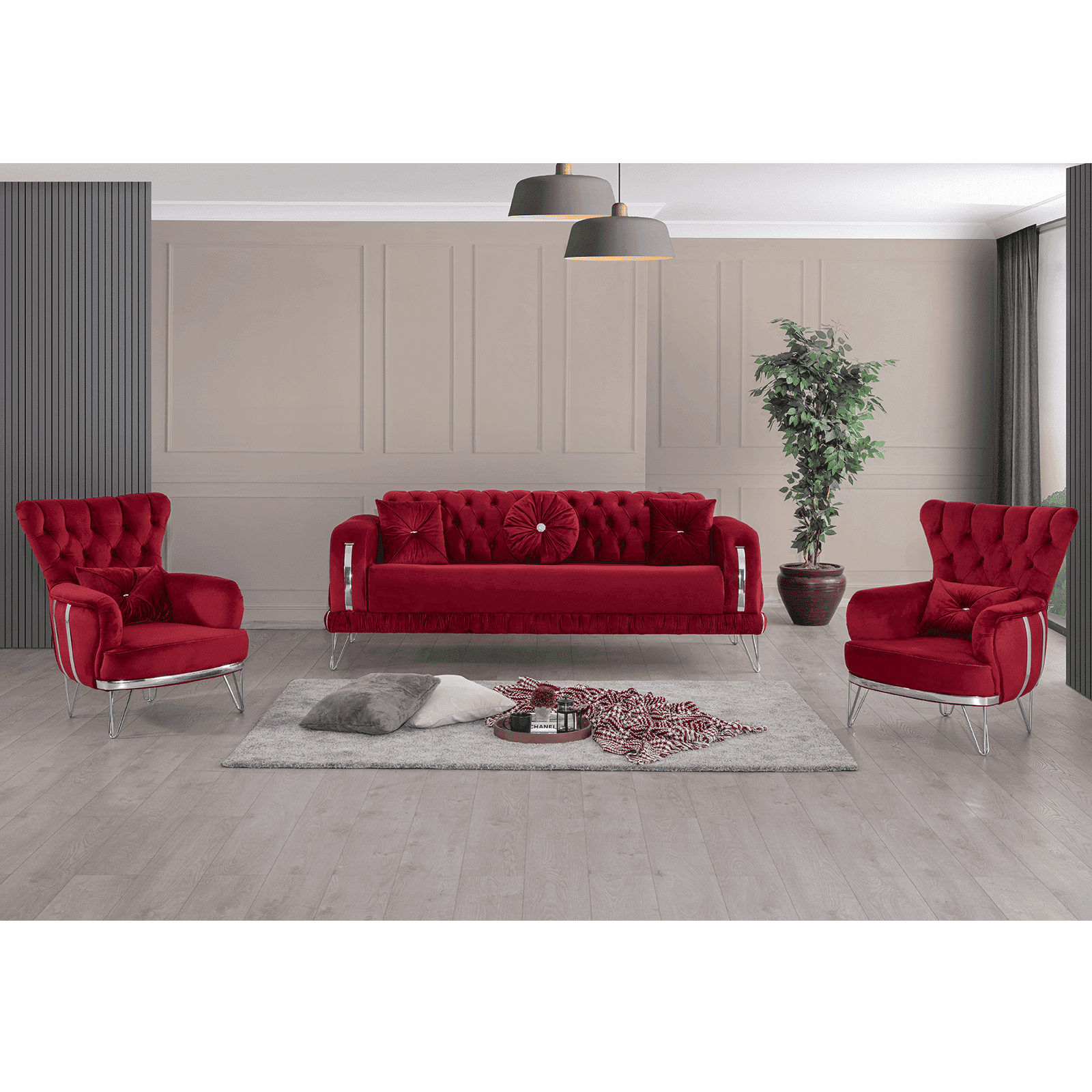 Atentie! Setul contine doar canapeaua si cele doua fotolii, elementele de decor (masute, vaze) nu sunt incluse.