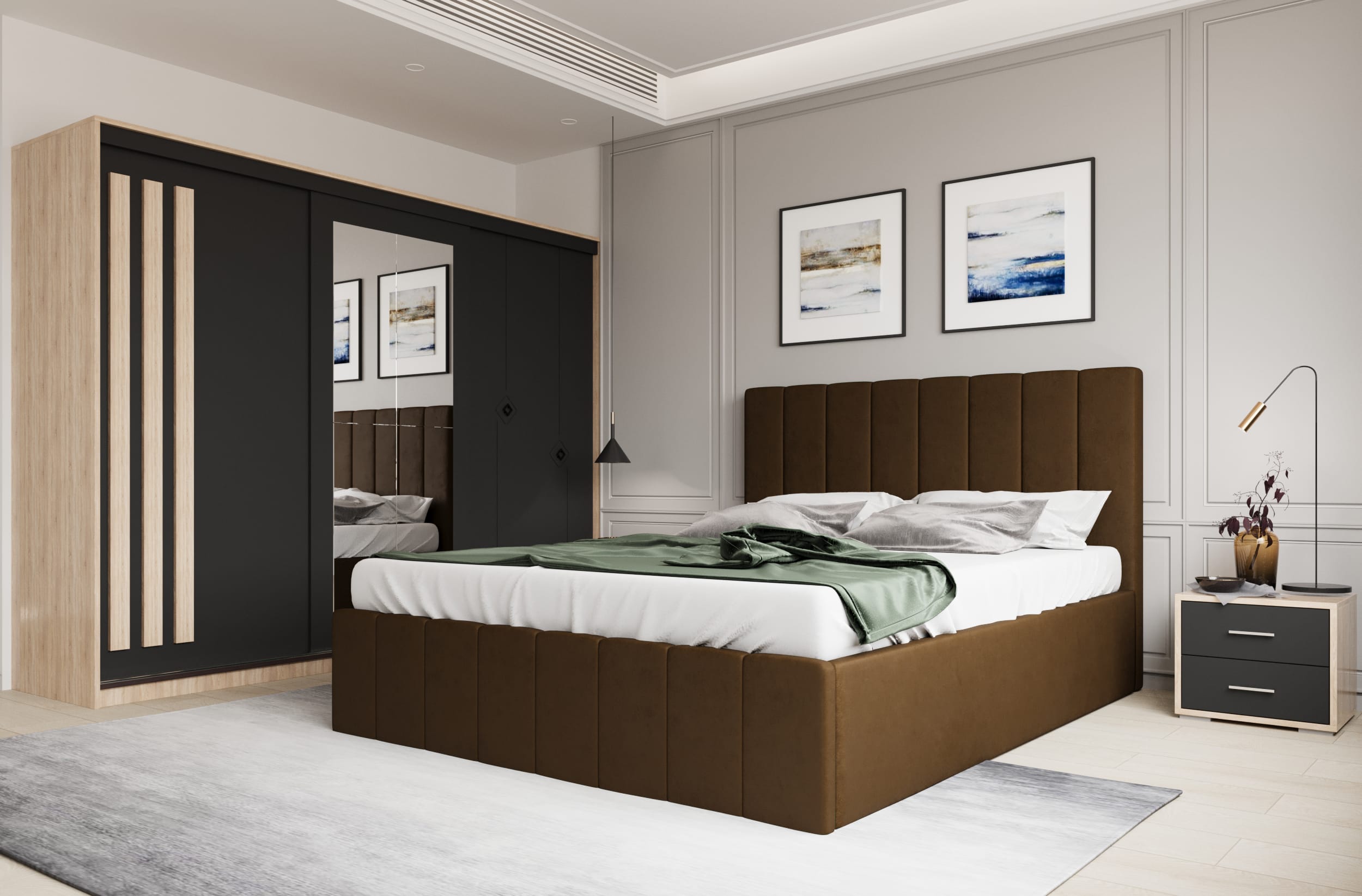 Un set de dormitor matrimonial cu pat tapitat si dulap cu usi glisante cu dimensiuni generoase. Deasemenea pentru Set dormitor Prado cu dulap Paris 200 cm puteti alege pat de diferite dimensiuni - de 140, 160x200 cm (acelasi pret) sau cu pat 180×200 cm. (pentru 180x200 cm se va achita suplimentar)