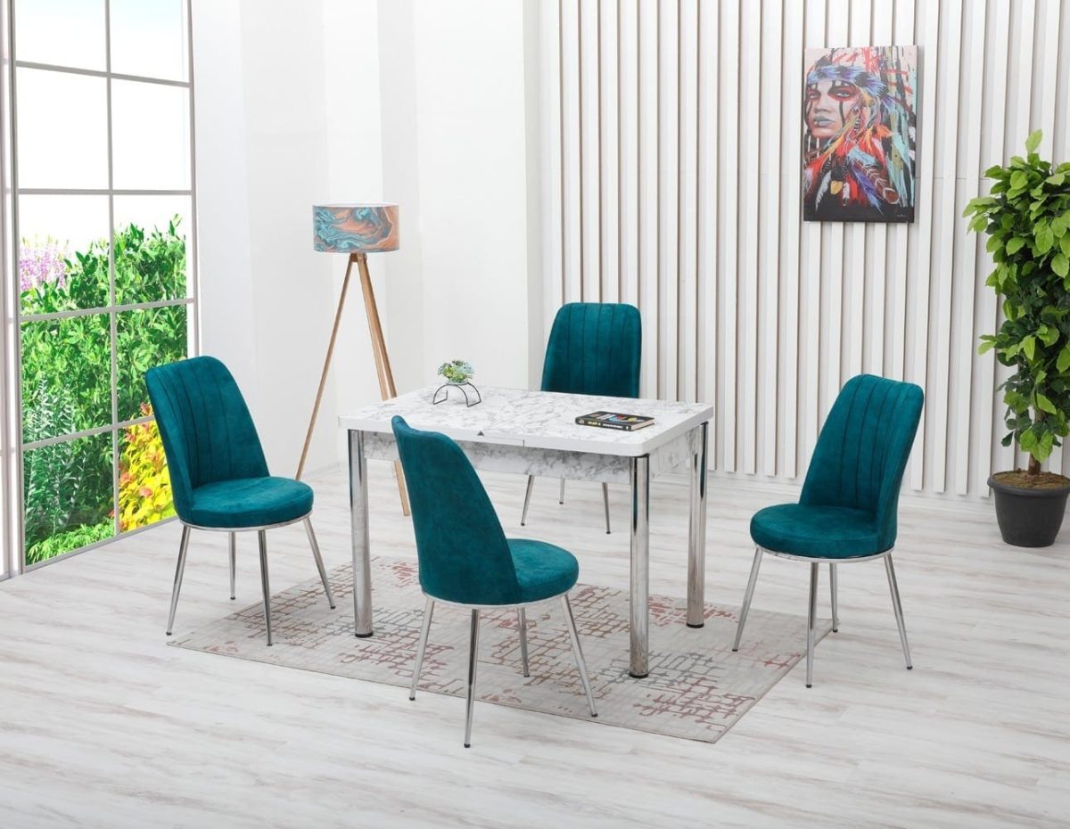 Set Sonia este compus dintr-o masa si 4 scaune tapitate cu stofa catifelata, fiind solutia ideala pentru servit masa sau pentru seri in familie. Cromatica setului vor da un plus de modernitate bucatariei sau living-ului casei dumneavoastra.