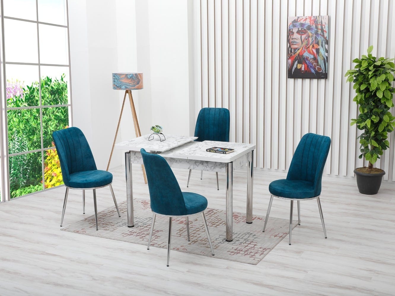 Set masa cu 4 scaune Sonia, Blat marmorat Alb / Scaune stofa Albastra
