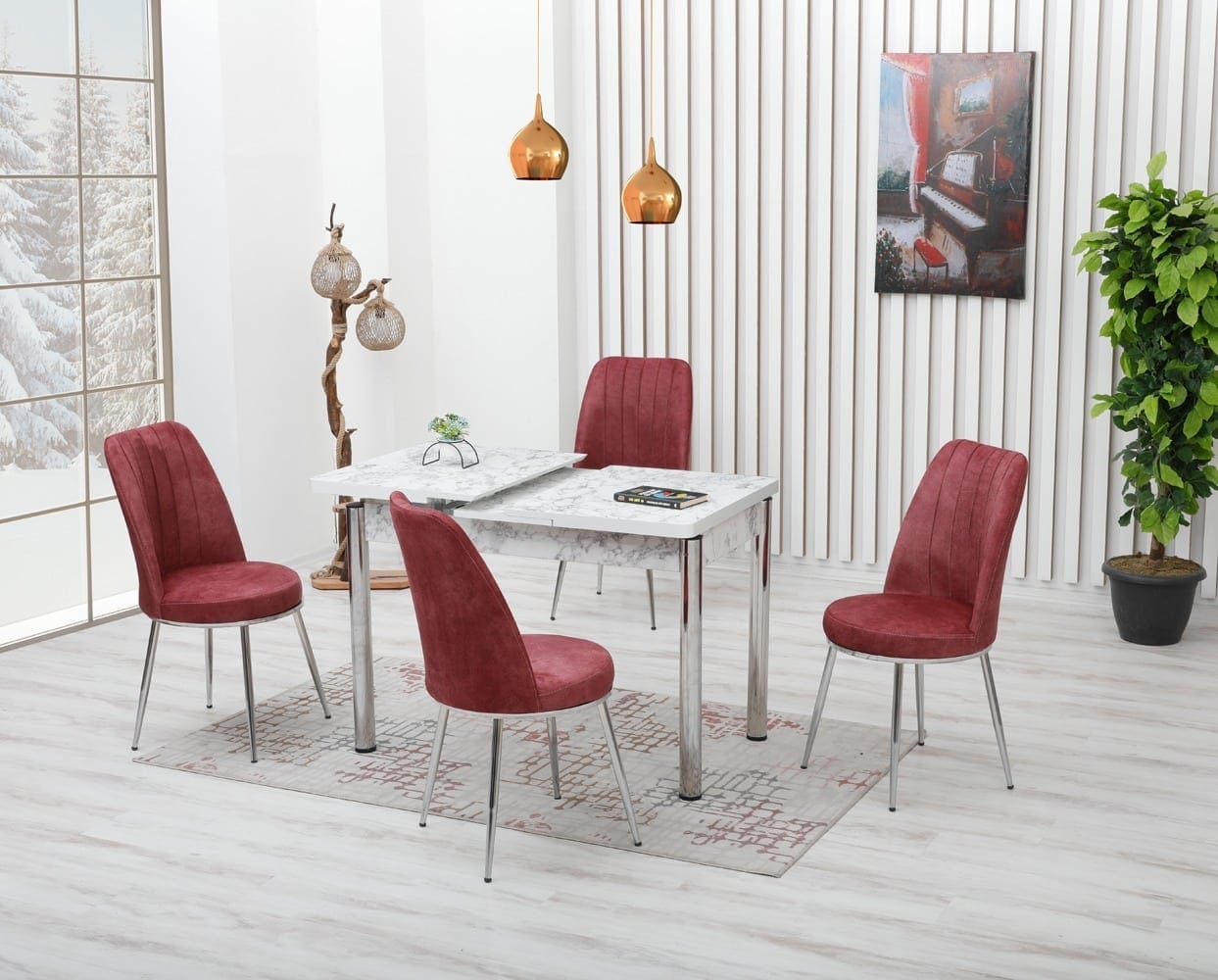 Set masa cu 4 scaune Sonia, Blat marmorat Alb / Scaune stofa Rosie
