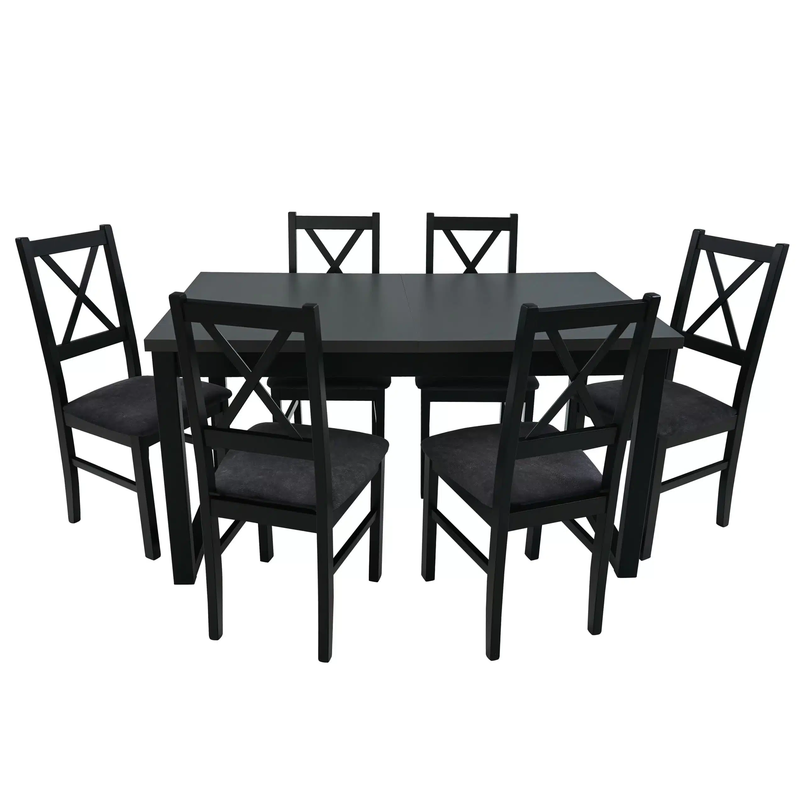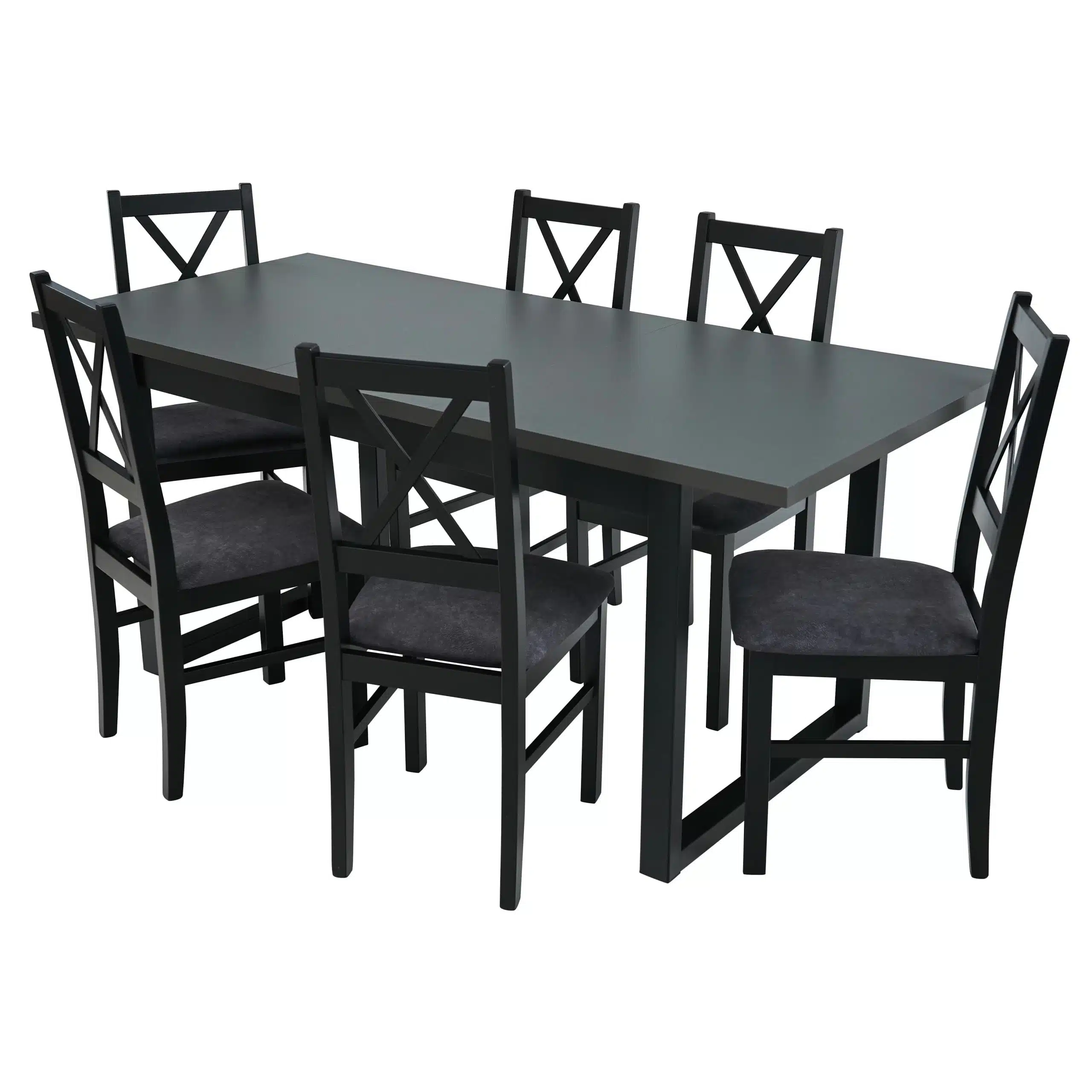 Setul este compus dintr-o masa Ikon 3, neagra cu blat gri grafit si 6 scaune Nilo 10 din lemn masiv negre cu tapiterie din stofa gri (24Z), fiind solutia ideala pentru servit masa sau pentru seri in familie. Cromatica setului va da un plus de modernitate bucatariei sau living-ului casei dumneavoastra.
